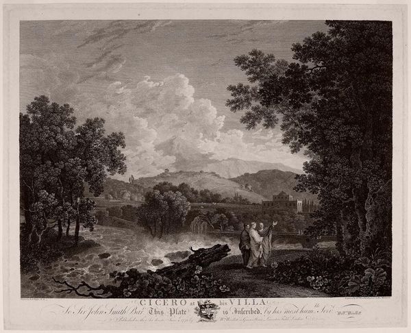 Curator: Here we have William Woollett's "Evening," held at the Harvard Art Museums. There's no specific date for this piece, but Woollett lived from 1735 to 1785. Editor: My first thought is how beautifully he's captured the light. The gradations of tone, from dark foreground to the pale sky, create a real sense of depth and quiet. Curator: Absolutely. And it's more than just aesthetics; this idyllic scene harkens back to classical pastoral ideals, a romanticized vision of rural life that often overlooked the realities of class and labor. The figures almost seem staged. Editor: Perhaps, but consider how the strategic placement of those figures, and the trees, directs our gaze toward the central tower. It's masterful composition. Curator: True, yet I can't help but consider the unseen power dynamics at play within such idealized settings. Who benefits from this vision, and who is excluded? What are the cultural politics driving it? Editor: Well, looking closely at the texture, you'll see the meticulous engraving that gives a luminosity to the scene. A technical achievement! Curator: And that technique helps to reinforce those idealized narratives, obscuring the social complexities of the time. Editor: It's a peaceful window, regardless. Curator: I suppose it depends on whose perspective is being considered.