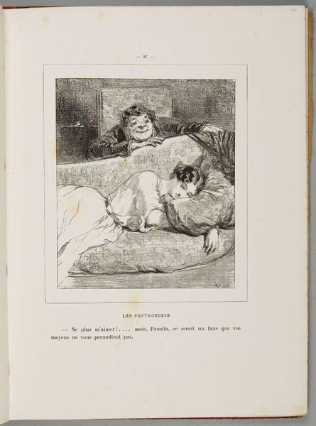 Editor: Here we have Paul Gavarni's "My dear: men, what a farce! It's always the same story: a woman has only herself. Crazy! Crazy!" It's a small print, and I'm struck by how much emotion he conveys with just a few lines. What do you make of it? Curator: It's raw, isn't it? Gavarni captures that feeling of utter exasperation, that "hands thrown up in the air" moment. I imagine her muttering this while tossing in bed, perhaps after a particularly disappointing encounter. He invites us into this very private, almost theatrical, space. Does that make sense? Editor: Absolutely. It feels like a stolen glance at a very personal moment. The way he uses the dark lines really emphasizes her distress. Curator: Indeed. It's a fleeting moment, yet it speaks volumes about the societal expectations and frustrations women faced, a feeling that still resonates, wouldn't you say? Editor: I think you’re right. There is a timeless quality to the sentiment, even today.