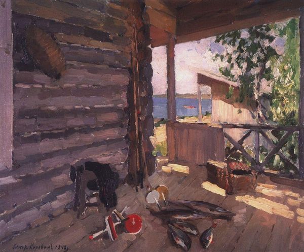 Editor: Here we have Pyotr Konchalovsky's "The Window of the Poet," created in 1935 using oil paint. Looking at the scene, I immediately get a sense of quiet isolation and the contrast between interior warmth and the cold, snowy world outside. How do you interpret this work? Curator: The painting operates on several layers. Beyond the initial impression, it’s essential to consider the historical and social context. Konchalovsky painted this during the Stalinist era, a time of intense political and social control. The "poet's window" becomes a potent metaphor for the artist's confined perspective, but also the enduring power of introspection, and, possibly, silent resistance. Do you notice the stark contrast between the bright, almost celebratory, patterned curtain and the austere snowscape? Editor: I see what you mean. The curtains feel almost like a deliberate act of defiance, a splash of color against the monochrome landscape. It's interesting to consider it in relation to the politics of the time. Curator: Precisely. Consider the book and the candle on the tray. They symbolize knowledge, reflection, and perhaps even a spiritual light against the encroaching darkness. Also, note that in 1935, avant-garde art was starting to fall out of favour, as 'social realism' took hold. Doesn’t that 'realistic' window view now seem loaded? Is it just a scene or something more calculated? Editor: That makes the painting much richer and more complicated than I initially thought. I had focused on its surface-level beauty. Curator: It’s a beautiful painting, but the political and social climate deeply informs its meaning. It's about questioning the relationship between the individual, creativity, and state control. This is how art allows dialogues across time. Editor: Thanks! This deeper understanding truly enhances my appreciation of it. Curator: And for me, your openness helps keep those dialogues alive!