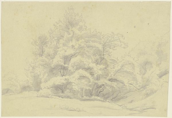 Curator: We’re looking at “Boslandschap,” a landscape drawing created between 1645 and 1646 by Pieter Moninckx. The medium here is pencil and possibly some watercolor washes. Artist: Oh, it's wonderfully evocative, isn't it? Sort of whispery. Like stepping into a memory of a forest, not quite a real place but something softer. Curator: Absolutely. Moninckx was working during the Dutch Golden Age, a period defined by increasing naturalism, though not divorced from established compositional ideals. I wonder what he intended by such seemingly casual linework. Is it unfinished? Is this a statement? The Dutch landscape was tied closely to ideas of national identity at the time… Artist: Mmm, I get more of a feeling that he wanted to catch something fleeting—like the light as it moves through leaves or maybe the first sketch of an idea for a bigger painting. You know, sometimes the underdrawings capture more truth, paradoxically. It doesn't have to carry a whole nation on its shoulders, right? Sometimes a forest is just a forest? Curator: True, but consider that even simple landscapes become sites where human intervention—or lack thereof—is charged with symbolic meaning. What kind of space is prioritized here, what feeling about it did Moninckx want to express? Artist: It feels very personal. If this piece had any commentary at all, I wonder if this represents a retreat or escape, a silent push away from urban hustle towards the comfort and complexity of a forest. Somewhere safe. A welcome feeling today. Curator: I see what you mean. Thinking about this piece now makes me contemplate access to these green spaces, especially for marginalized communities who historically have been excluded from such restorative environments. Moninckx reminds us that the pastoral idyll has always been socially constructed, and access must be actively cultivated. Artist: Exactly, which is something worth contemplating now too, yes? It's wild how something so seemingly simple can branch into so much.