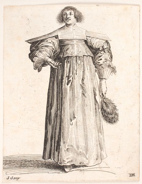 Curator: Pietro Bertelli's engraving, "La Cortigiana de Roma," dating back to somewhere between 1575 and 1585, offers a fascinating glimpse into the genre painting and portraiture styles that defined elements of the Italian Renaissance. Editor: Okay, so first impression: she looks like she's trying to hide, or maybe she's a stylish ghost. That draped fabric is…voluminous! Is that intentional? Curator: Indeed! The piece, residing now at The Met, serves as an invaluable record of the visual language employed around Roman courtesans during this period. It provokes crucial conversations about the construction of identity and the lived realities of women within early modern European society. Editor: I guess so! I see the title written there. La Cortigiana de Roma. She certainly isn’t hiding her title even if she might be hiding in that cloak! Jokes aside, thinking about visibility and societal expectations back then—what message did Bertelli send? Curator: Bertelli cleverly uses dress as both revelation and concealment. It seems that this tension between public display and privacy speaks volumes about the complexities of a courtesan’s position: her social power and precarity, performance, agency, visibility. Editor: Exactly. She’s kind of saying "look but don't touch," you know? Maybe that cloak’s also a sign of self-possession… a way of controlling access. Or maybe a disguise after all. Curator: Thinking about it formally, I'm particularly interested in how the engraving technique—the meticulous hatching and cross-hatching—emphasizes the materiality of the fabric, highlighting textures, adding an air of realism, almost daring the viewer to judge the morality, the place, the social standing of its subject. Editor: Right! The more you see, the less you know, huh? This forces us to think about our assumptions and her individual reality within larger social frameworks and narratives of that period. Not bad, Bertelli! Curator: Absolutely. Thank you for seeing through this with me; I find this piece opens a much-needed critical discourse on art historical convention versus lived female experiences. Editor: Glad we peeled back some layers, literary and sartorial. Always more to uncover.