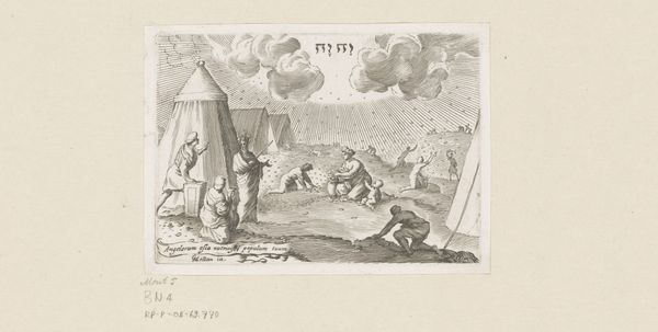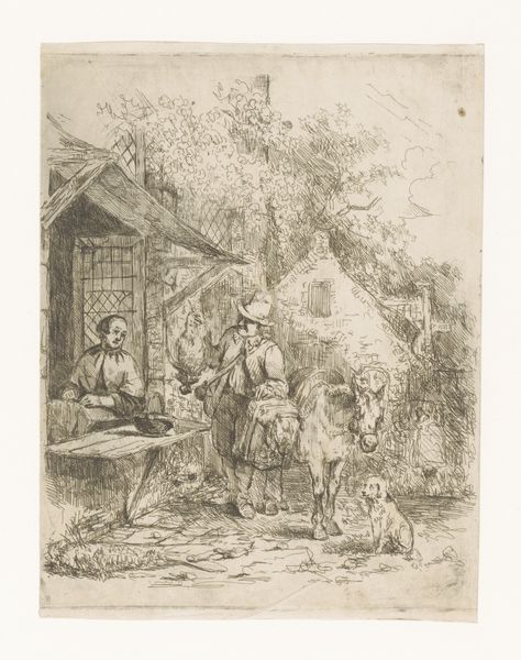 Curator: This print, known as "Fotoreproductie van Der Fischmarkt," offers a fascinating glimpse into a 19th-century fish market, probably dating from around 1870 to 1900. Editor: It has a melancholic air, doesn't it? Somber even, despite the supposed hustle and bustle of a marketplace. I am immediately drawn to the intricate details despite the scene feeling static. Curator: Yes, it is interesting how they manage to get this look by working the print. It's an engraving, of course. You can see how the engraver meticulously worked the plate to create the dark tones and fine lines. Look closely at how the clothing, and in particular, the way the scales of the fish glimmer. Editor: Thinking of the artist’s labor... It's compelling how this anonymous print captures the energy – or the exhaustion – around these trades. It points to how critical these marketplaces were for feeding communities. Did most of the people who made prints like this consider themselves "artists," or laborers fulfilling the demands of image circulation? Curator: Both, perhaps? There's clearly an artistic sensibility at play, the way the composition guides our eye, drawing our attention to the figures clustered around the basket of fish, yet it also served a very practical purpose: disseminating information about everyday life and potentially romanticizing those events. Look at the small child sitting on the base of the wagon - he appears to be playing with some wood scraps. Editor: That is a nice addition, a certain poignancy contrasting the work of all those other workers. It makes one think about the lives that weren’t available to those born into that life, or even of that child inheriting those exact functions. Curator: It’s a somber thought indeed, and speaks to the broader narrative of social realism that became quite popular in portraying everyday life. I suspect it captures the human condition and offers it for wider viewership. Editor: True enough. By concentrating on a print from the end of the nineteenth century, we get insight into a certain kind of making, the commodification of artistic production, and how we have come to see the work of art itself, and the labor it required. Curator: It’s almost haunting. I find that perspective illuminating.