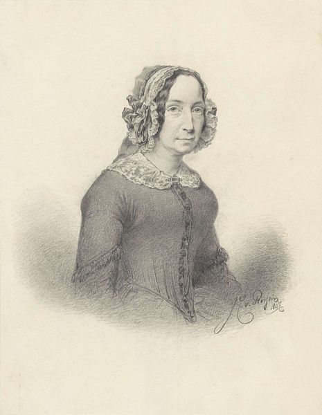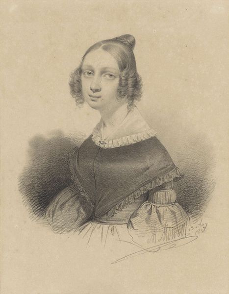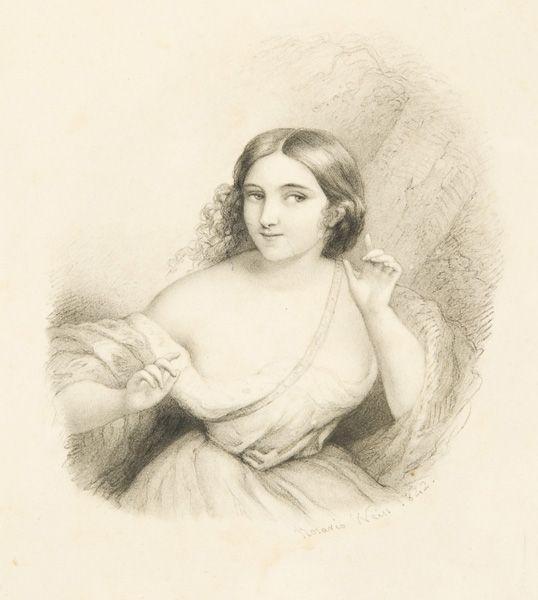 Paul Gavarni created this lithograph titled "Mme. Montigny," capturing a woman who was most likely part of the bourgeoisie, in the 19th century. Gavarni was known for his satirical observations of Parisian life, especially focusing on the lives of women. Here, the delicate rendering of Mme. Montigny's features and attire speaks to the visual language of the era, a time of shifting social codes and expectations for women. Although the image seems to depict a conventional representation of a woman, it invites a more nuanced reading. What does it mean to portray a woman with such a gaze during this period? Is it a reflection of her societal role, or does it hint at the inner complexities of identity? This portrait offers us a glimpse into a world where identity was both performed and scrutinized, inviting us to consider the personal narratives that lie beneath the surface of representation.