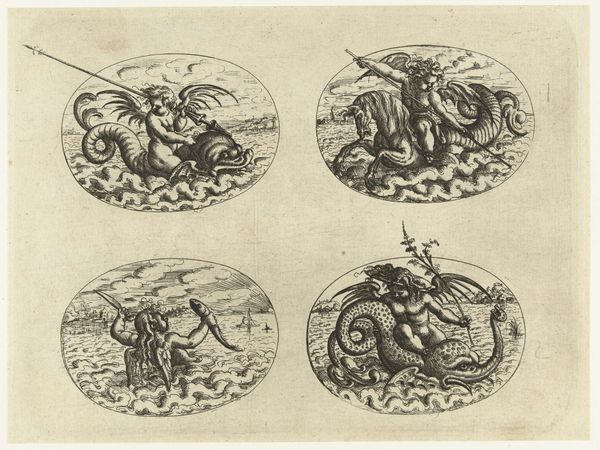 "Vier liggende ovalen met putti op zeewezens" was created by Christoph Jamnitzer around the turn of the 17th century. These finely rendered engravings reflect the cultural fascination of the Renaissance with classical mythology and the natural world. Jamnitzer’s work provides a window into the social and cultural values of his time. Each oval depicts a scene of putti – often interpreted as cherubic representations of innocence or youthful desire – riding fantastical sea creatures. Think about the symbolism: what does it mean to pair innocence with untamed, mythical beasts? These images served as more than mere decoration. They were emblems of power and status, intended to adorn luxury items and convey the owner’s sophistication. The detailed engravings and allegorical elements of Jamnitzer's prints reflect a world where art and craftsmanship were interwoven with social identity. His imagery asks us to consider how societal values are physically manifested.