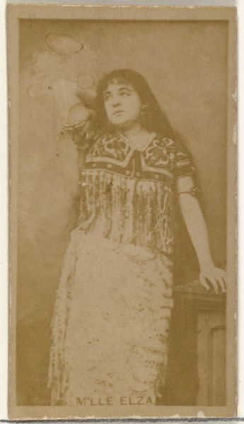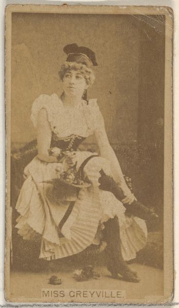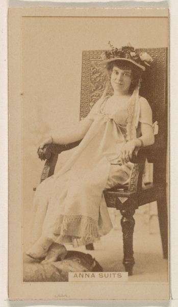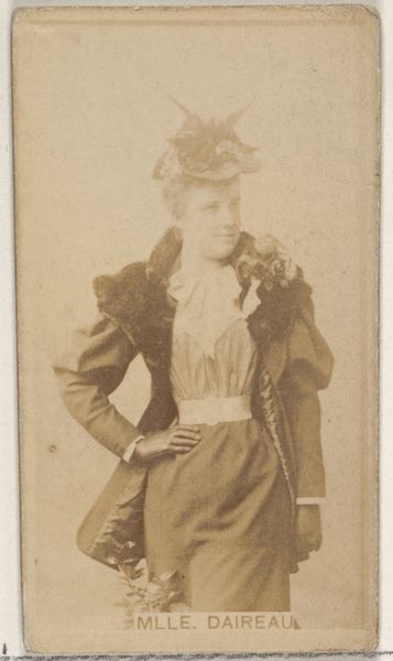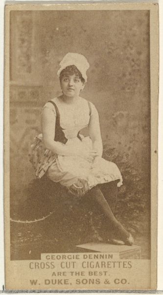 This photograph of an actress in a striped dress comes from a series made around the turn of the 20th century by W. Duke, Sons & Co., to promote Duke Cigarettes. It's a simple albumen print on card, a process that was by then highly mechanized. The card format is key here. These were essentially calling cards, small enough to be collected and traded. But beyond mere advertising, they also reflected a culture of mass production and consumption. Photography had become a key tool in both. The actress herself, poised and elegantly dressed, is also part of this economy. She is presented as a desirable image, an aspiration. By associating her glamour with their product, Duke Cigarettes were selling not just tobacco, but an entire lifestyle. The striped fabric of her dress may even have been manufactured by the same methods that printed these cards. So, this little picture is more than just a pretty face. It’s a window into the industrial revolution, and the way that art, commerce, and desire became intertwined.