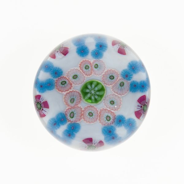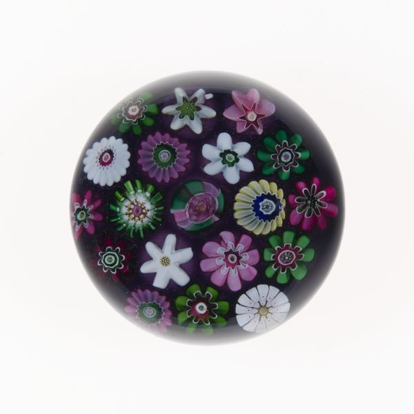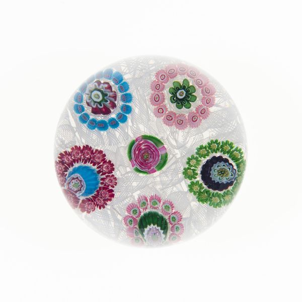 Editor: This is "Paperweight", crafted by the Clichy Glasshouse around the 19th century. It’s a charming little thing currently held at the Art Institute of Chicago, seemingly made from glass with paper elements? Its gentle, rosy hue evokes a nostalgic sweetness. What catches your eye about it? Curator: Initially, one must observe the construction: the formal interplay between the transparent glass dome and the embedded millefiori. Semiotically, the clustered floral motifs resonate with ideas of abundance, contained within the structured form. Do you perceive any tension between the overall symmetry and the minute variations within each floral element? Editor: I think so! There's something almost playful in the subtle asymmetry; each flower seems distinct. It's as if order and whimsy are caught in this delicate balancing act. What does that balance convey to you? Curator: The very act of containing, of preserving fleeting beauty, speaks volumes. Notice how the light is refracted; how does the formal element of light contribute to the artwork’s meaning? Editor: Oh, good point! The refraction does create an illusion of depth. Light turns the artwork almost into a miniature universe, chaotic yet controlled. It seems there’s intention even in apparent randomness. Curator: Precisely. Such formal rigor contributes a sense of underlying structure, hinting that the interplay between apparent chaos and controlled design generates the enduring aesthetic appeal. A compelling consideration, wouldn’t you agree? Editor: I do agree! Looking closer has unlocked this secret world held within this pretty paperweight.