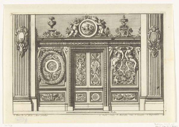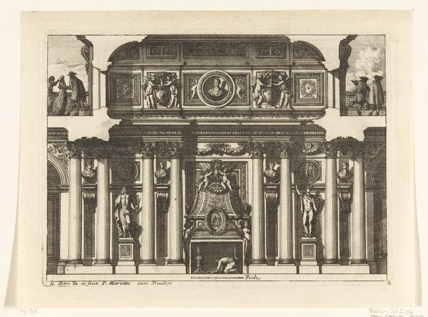 Editor: Here we have Jean Lepautre’s "Muur met standbeeld van Franse koning," a drawing, etching and engraving from around 1655-1657. I’m really struck by how this print captures the grandeur and aspiration of power. What do you see in this piece? Curator: This print offers a fascinating glimpse into the visual language of power in 17th-century France. Consider the strategic deployment of classical motifs – the columns, the royal statue – designed to evoke the authority and legitimacy of the French monarchy, and of course, the Baroque style! This wasn't merely decoration; it was a deliberate projection of power within a highly codified system. Editor: So it's like visual propaganda? How would prints like this be used? Curator: Exactly! Prints like these served a vital public role. They were disseminated widely, allowing the royal image and associated symbolism to permeate different levels of society. This print is both promotional and instructional – a way of showcasing the aesthetic and political ideals the monarchy sought to promote. The control of imagery was crucial to political dominance, and to influence opinion on royal initiatives, shaping public memory of the reign. Does the detail "A Paris Chez Pierre Mariette..." suggest anything to you? Editor: Right, it was made for distribution! I hadn't considered it so literally before. It really puts the artistry in perspective. I appreciate learning to recognize the role that art played in establishing cultural identity. Curator: Absolutely. Reflecting on the way these images circulated enriches our understanding of 17th-century power structures and public perception, adding nuance to how we think about art history.