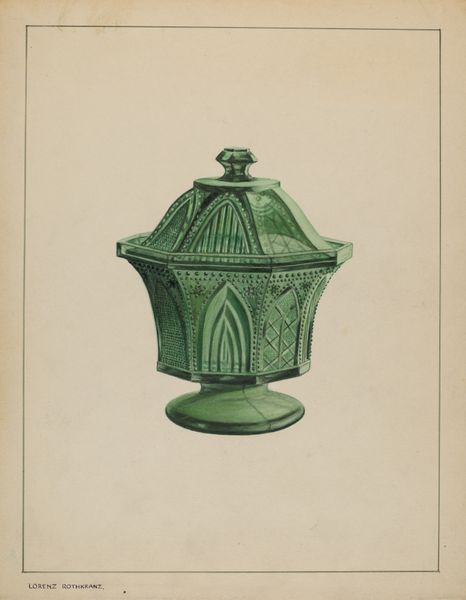 Curator: Looking at this, I immediately feel a sense of nostalgia for a bygone era, almost a faint echo of mid-century Americana. Editor: That's interesting. I was about to introduce this pencil drawing titled "Cracker Jar," dating to around 1940 by Henry Moran. What resonates so nostalgically for you? Curator: Well, the simple subject matter, of course, speaks to domestic life. More subtly, there is something in the careful rendering of light and shadow that elevates the mundane. A simple cracker jar rendered with so much attention! There's almost an underlying commentary about class and material culture. Editor: I can see that. It reminds me of Dutch vanitas paintings, a mundane object representing a fleeting moment. How intriguing, this particular pattern of circles and the facets create a hypnotic quality, reminiscent of older methods used to reflect status in the early 20th century. Curator: Exactly! I find myself wondering who owned the original jar and what its significance was to them. It prompts me to consider what these simple objects might reveal when placed under our scrutiny in a contemporary context. What narratives would such things contain about identity? Editor: I wonder about the artist's choices too. The selection of graphite heightens the contrast of transparency with a more concrete state of objecthood. Was the intention simply aesthetic or did he have the same notions? It makes me wonder about the history of domestic rituals in mid-century America; what did this cracker jar *symbolize* for those who kept it on their tables? Was it luxury, common practice, or merely a vehicle? Curator: It really is evocative. We seem to agree this simple object opens avenues into much wider concepts of both memory and culture, the personal and the historical. Editor: Indeed, a wonderful exercise for observing just how complex something so unassuming can become.