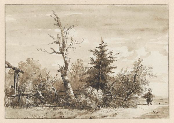 Curator: Looking at this delicate pencil drawing by Willem Cornelis Rip, entitled "Naaldbomen bij Beek", or "Pine Trees by the Creek," created sometime between 1874 and 1878, I am immediately struck by its hushed, almost ethereal quality. Editor: There's an undeniably calming atmosphere. The soft, light strokes lend the scene an air of quiet contemplation. It almost feels like looking at a memory of a forest rather than the forest itself. I wonder how that atmosphere relates to ideas around Romanticism and representations of nature at that time? Curator: Rip's adherence to Romantic ideals of nature is really clear when considering this delicate, seemingly untouched forest; it reflects the prevailing reverence for the natural world so prominent at the time. But also how these images contributed to national identity. This specific kind of scene plays into the narratives surrounding Dutch cultural heritage during that period. These idyllic images also obscure potential inequalities within representations of the Netherlands, wouldn't you agree? Editor: Absolutely. The choice to depict this secluded, pristine scene excludes human presence, perhaps subtly reinforcing a specific, elite vision of the national landscape—one where ownership and access may not have been universally shared. By the late 19th century, artists were already contesting these picturesque traditions. Curator: The almost photographic realism enabled by pencils gives immediacy. This closeness gives this sense of intimacy and direct experience. Editor: Indeed. Considering the time, the material speaks of both privilege and artistic commitment. The accessibility and affordability of pencil drawings allowed a wider segment of the artistic population to practice landscape art, even though these works would likely still find an audience within the elite. Curator: And despite the subtleties, one can feel its connection with the Northern Renaissance style too. In Rip’s artwork there is an acute observation of natural forms with such precision, just like they favored. Editor: Looking at it now, I realize how much I appreciate these landscapes being presented through a progressive critical eye. Curator: Examining how images can also participate in conversations around nationalism or inclusivity, shifts its meanings into the future.