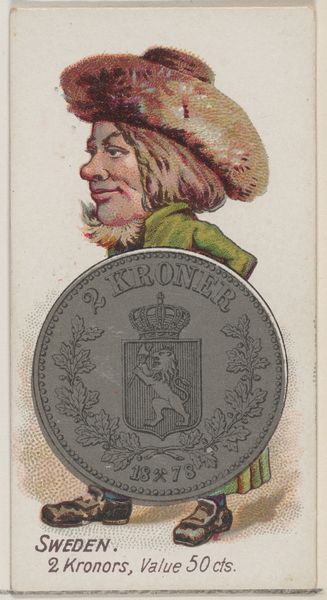 Curator: Here we have a piece called "Ecuador, 2 Reals" from the series "Coins of All Nations" by W. Duke, Sons & Co., dating back to 1889. It's a mixed-media print—something between a poster and a collectible card, really. Editor: Oh, wow. My first impression is that it has the spirit of old-timey advertisement—equal parts fascinating and unsettling. Curator: Tell me more about that feeling. Editor: It's the caricature, mostly. This grinning miner, with that impossibly large Ecuadorian coin seeming to prop him up, the symbolism here feels rather… complex. Is this reverence or something else? Curator: The series was indeed created to promote Duke brand cigarettes. It offered a whimsical look at currencies from around the globe. But you're right to sense complexity. The coin looms large, obscuring the worker, the backbone of the whole monetary system—all ultimately dwarfed by the looming "Duke." It reminds us to what extent our cultural memory of nations were distilled down to marketing tropes. Editor: And even the choice to depict a coin at all! Coins as potent national symbols – wealth, power, history… they're compressed narratives ready to be spun for consumerism. You’ve got the eagle, the mountain range and boat; a microcosm for Ecuador. Curator: It really does compress so much! The miner himself, poised on what appears to be a sandy incline, holding a pickaxe – classic symbol of labor, exploitation of the earth. The colours – the pastels, almost aggressively bright, feel like they're sugarcoating something harsher. It's strange seeing it all play out like this. Editor: It also evokes a time capsule that tells a story – a kind of innocence in this commercial, early advertisement. The series as a whole offers little glimpses into how countries perceived and how companies used the iconography of others. It gives me some historical and cultural perspective, I didn't know that I needed to learn more about. Curator: Absolutely, an early type of cultural imperialism. That the artist chose to position labour with country with tobacco does provide a curious glance into our commodity world. It's a fascinating artifact that invites deeper reflection, both of which it provides in very distinct qualities.
