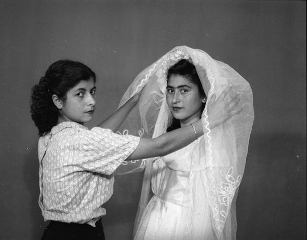 Editor: This photograph, taken between 1948 and 1953 by Hashem el Madani and later attributed to Akram Zaatari, captures two women in matching outfits. Their expressions seem so serious. What formal qualities stand out to you? Curator: The composition strikes me first. Note the tightly framed subjects against a plain backdrop. The mirroring effect, created by the matching outfits and poses, establishes a strong visual rhythm and symmetry that borders on the unsettling. Editor: Unsettling? In what way? Curator: The repetition, the near-identicality, creates a surface tension. The photograph doesn't quite allow for individuality. It poses interesting questions about identity versus conformity. The light also plays a role. Notice how it's diffused, almost flattening the image. Editor: I see what you mean now. I initially focused on the subjects themselves, but analyzing these formal elements adds so much depth. Curator: Indeed. Close formal analysis allows the viewer to think about the tension between individuality and conformity in portraiture.