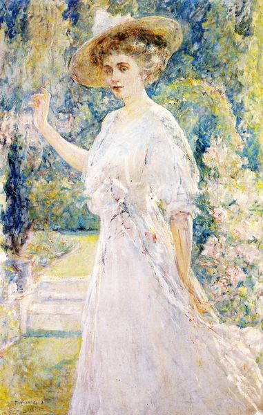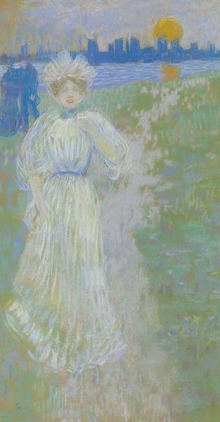 Robert Lewis Reid painted "Summer Breeze" with oil on canvas in the United States at the turn of the century. It depicts a woman in a white dress standing against a landscape of trees and sky. Reid was part of a generation of American artists drawn to Impressionism. They found ways to express American ideals through this European style. Note the woman's gaze, directed off to the side. This creates a sense of longing or anticipation. The style is soft, with muted colors and visible brushstrokes that evoke a mood of quiet reflection. Paintings such as this can tell us a lot about the social roles of women, the cultural values of the American upper class, and the place of art institutions in shaping taste. Art historians might look to period literature, fashion trends, and exhibition records to contextualize this work further. Ultimately, art is meaningful in connection to the social and institutional context.