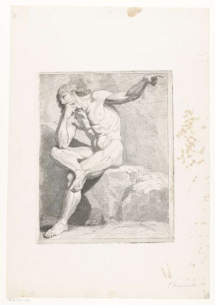 Bernard Picart etched this study of a nude man in the early 18th century. The figure, draped in cloth, sits pensively before a barren tree. This motif, linking the human form with the natural world, echoes themes found in antiquity. Think of the classical sculptures of philosophers beneath the shade of a tree. Here, however, the tree lacks vitality, reflecting perhaps the figure's inner state. The melancholic pose and the stark setting call to mind the imagery of hermits and penitents, figures often associated with introspection and spiritual quest. Such imagery reminds us of earlier depictions of Adam and Eve, where the tree represents a pivotal moment of knowledge and loss. Picart subtly nods to this tradition, evoking a deep-seated sense of human vulnerability and existential questioning. The emotional weight of this piece lies in its ability to tap into our collective memory of loss, reflection, and the search for meaning.