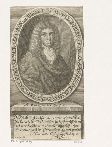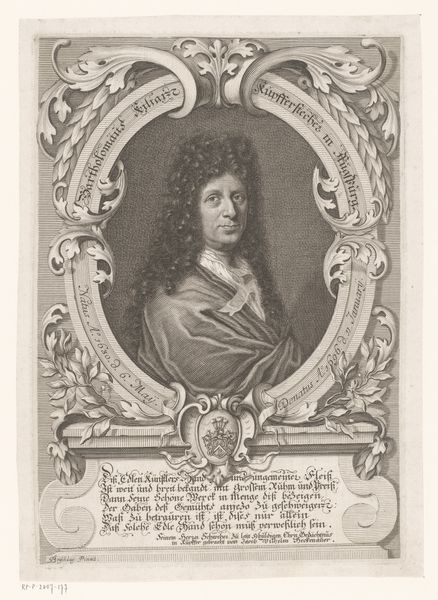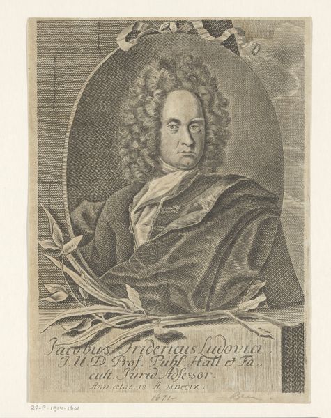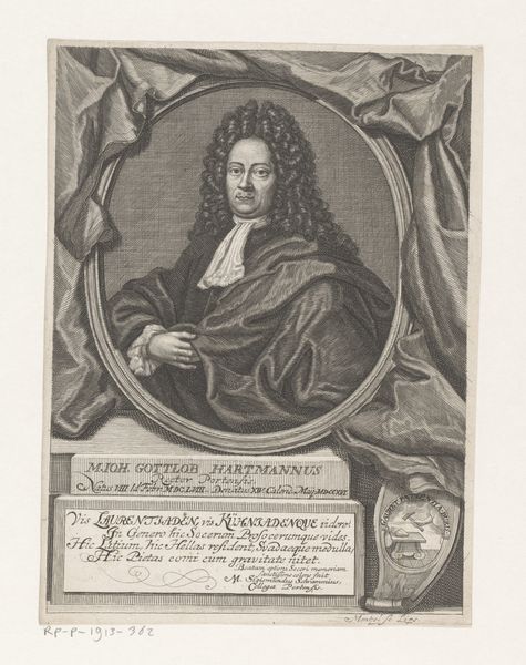 Editor: Here we have "Portret van Johann Michael Sutorius," an engraving likely created around 1708. It’s a compelling image, somewhat austere. What do you make of it, with its dense detail and, notably, the prominent skull? Curator: Immediately, the stark chiaroscuro and elaborate framing device attract attention. Observe how the artist orchestrates visual hierarchy, with the sitter centrally placed within an oval cartouche, almost enthroned, yet firmly grounded through sharp value contrasts. Is there an inherent tension between presentation and message? Editor: Definitely. The portrait celebrates Sutorius, but the skull is a clear "memento mori." How do these contrasting symbols interact? Curator: Precisely. The skull destabilizes a straightforward reading of honour. Its placement calls our attention to the limits of skill or craft or status in confronting mortality. Note that the subject's gaze does not quite meet our own. It is fixed with soft indifference, directing one to his own transience. What sense does this give? Editor: It is a rather sober presentation. The skull might act as a warning, subtly undermining the subject's earthly accomplishments. Perhaps we're meant to question vanities in all their forms? Curator: In considering the interplay between its visual components, we've discerned more than first appearances reveal. It reminds one of art's complex functions to not merely to memorialise, but also to provoke critical inquiry. Editor: It's fascinating how formal analysis draws out so many potential readings!