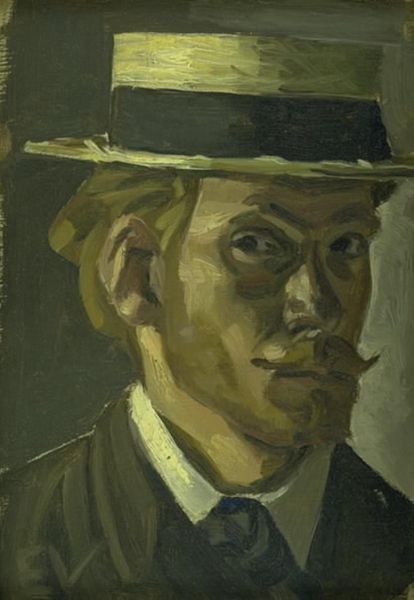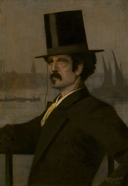 Curator: Walter Sickert's portrait, "Jacques-Emile Blanche," certainly projects an air of reserved, almost theatrical, composure. Editor: Indeed, the brushstrokes, broken and uneven, give the impression of a mask barely concealing something. The top hat is such an odd symbol. Curator: Sickert painted this, and many other portraits of fellow artists, within the context of the late 19th-century artistic circles. Blanche was, himself, a well known painter, critic, and writer. Editor: The hat seems to be used as a symbol to denote the sitter's status within Parisian society. But, the painterly execution does seem to undermine such an idea. Is the portrait supposed to undermine the sitter? Curator: Perhaps Sickert is asking us to consider the performative aspect of identity, the public face versus the inner self. Editor: It's a wonderfully unsettling portrait that invites us to think about the weight of social expectations and artistic expression. Curator: A very modern sentiment, indeed.
