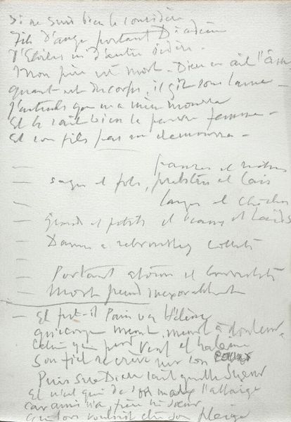 Curator: We're looking at an untitled work by Sir Eduardo Paolozzi. Editor: It's a script, really, with an urgent, almost manic energy in its lines. Curator: Yes, the text is central. Note how Paolozzi uses phrases like "dreadful symmetry" and "trapped light". The composition is defined by this textual structure. Editor: The phrase "Picture of a sculpture" suggests the artist is chasing after something, a memory perhaps? The themes of antagonism and memory are compelling. Curator: Precisely. Paolozzi is exploring the semiotics of form through language. The words, their arrangement, create a visual architecture. Editor: For me, it’s more about how these word-images conjure a whole world of lost, monumental forms and the emotions attached to them. Curator: I see Paolozzi’s breakdown of form. Editor: I am taken with lost history.
