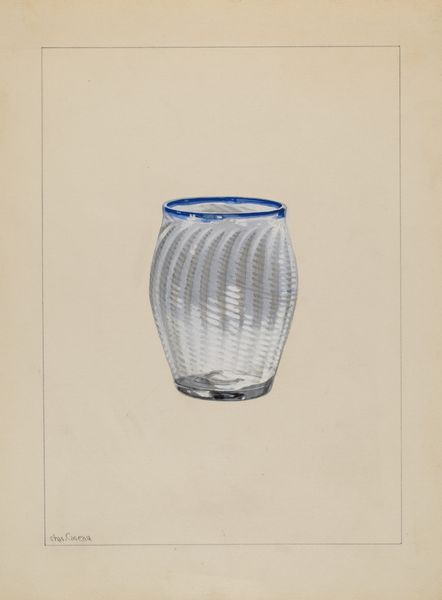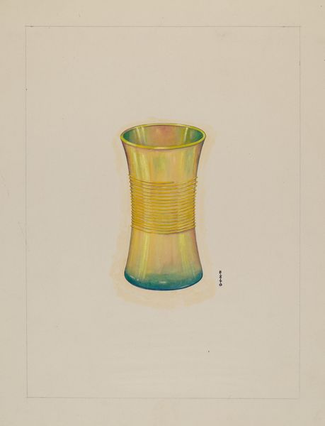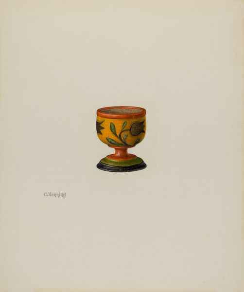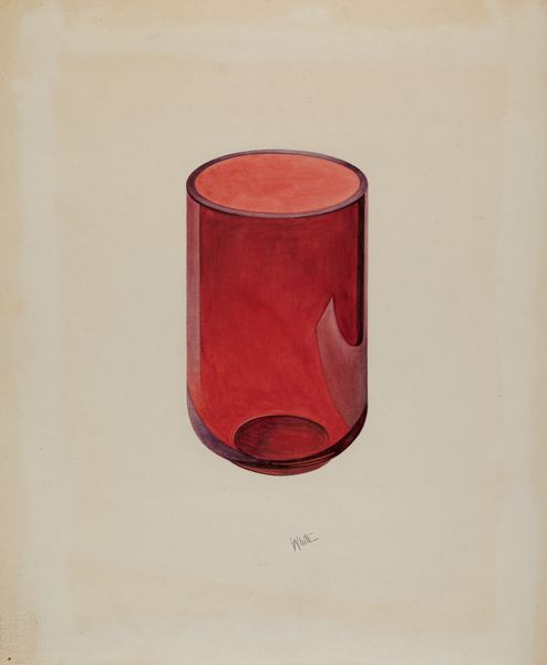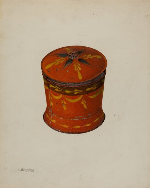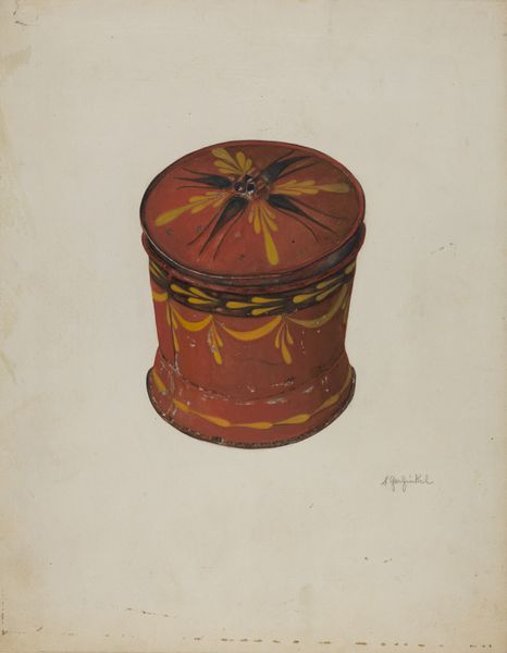 This is Jacob Gielens' "Toleware Tin Tea Caddy", a watercolor drawing. The composition immediately strikes us with its symmetrical arrangement, a central axis dividing the form into two identical halves. Notice how the bright red background contrasts sharply with the bold black and gold decorative elements. These aren’t merely aesthetic choices; they reflect a deep-seated interest in structure, and the artist engages with the push and pull between positive and negative space. The curvature of the petals or leaves creates a rhythm that draws the eye around the object. This rhythm destabilizes a fixed, static reading of the caddy, implying movement and change. The structure of the composition, coupled with the interplay of color, suggests that Gielens isn't just representing an object. He's exploring how form itself can be a carrier of meaning, creating a visual language that invites us to question fixed meanings and embrace new perceptions.
