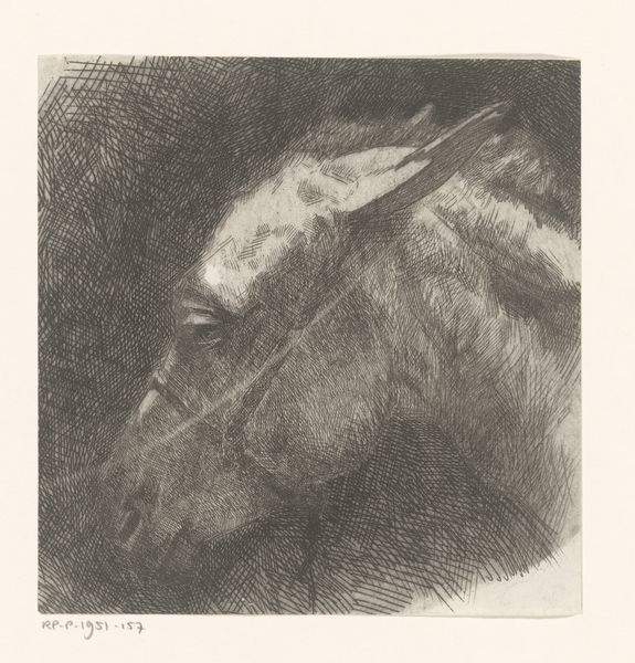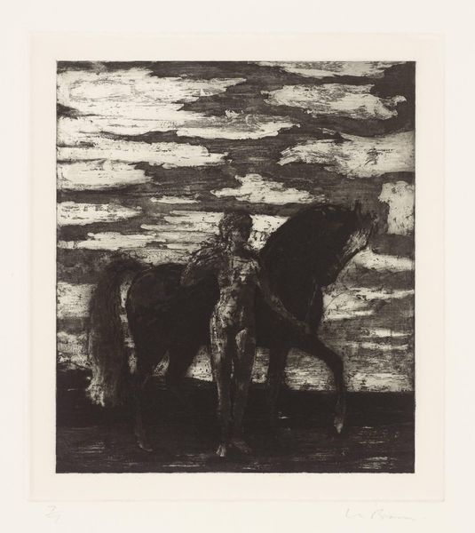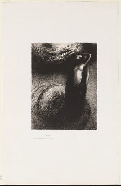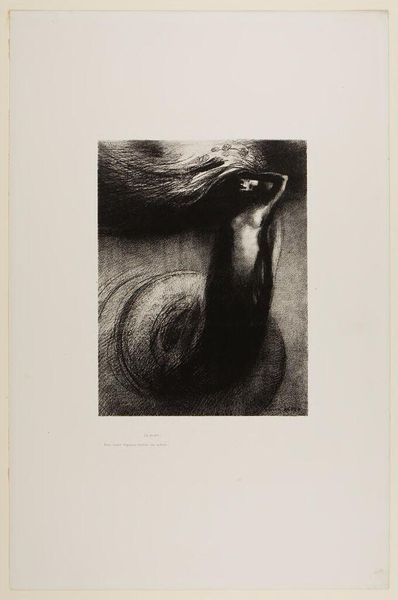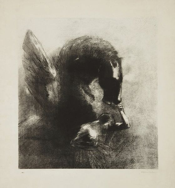 Curator: A rather somber piece, wouldn't you say? Editor: Indeed. The dense, almost impenetrable blacks are immediately striking. It creates a mood of intense confinement and, frankly, despair. Curator: Here we have Odilon Redon’s "Captive Pegasus," a lithograph from 1889 currently residing at the Art Institute of Chicago. It’s printed in ink on paper, if we consider the raw materials, and how the print medium enables the possibility for replication and distribution...this allows for the democratization of the artwork. Editor: The formal qualities work beautifully to convey its subject. The oppressive darkness almost seems to suffocate the figure of the Pegasus. It's huddled, its wings seemingly useless, and a human figure is presented behind, dominating it. Redon masterfully employs chiaroscuro to emphasize this contrast, pulling Pegasus’s form from the inky blackness, whilst a worker appears above. Curator: The industrial elements of the period deeply affected Redon. The figure towering over the captive pegasus gives some suggestion as to the labor associated with the image. It begs the question, who or what has trapped the mythological creature? Editor: The composition also suggests that the Pegasus is yielding the hammer used for labor by the human figure; perhaps the figure symbolizes oppressive industrialisation. The strong diagonals create dynamism, but they are ultimately contained within the rectangular format of the print. A palpable sense of tension that adds to the feeling of frustrated power. Curator: I find myself pondering the social commentary embedded in the very production of this print. Its symbolism transcends mere artistic expression, it reveals concerns about the working population in France, and perhaps its title should be more literally interpreted, how dreams become 'captive' within industrial infrastructure. Editor: Perhaps we can read the work as an allegory for the suppression of imagination, or of beauty, in an increasingly industrial age. Formally, it serves as an enduring visual embodiment of such concerns. Curator: A potent combination of material reality and symbolic weight that continues to spark debate and discussion, even today. Editor: A compelling exploration of light, shadow, and form, evoking the poignant struggle between myth and the stark realities of the modern world.