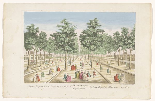 Editor: Here we have "Gezicht op een boulevard te Parijs gezien vanaf de Porte Saint-Antoine," or "View of a boulevard in Paris seen from the Porte Saint-Antoine" by Louis-Joseph Mondhare. It’s an aquatint from around 1759-1796, located here at the Rijksmuseum. The colors are delicate, and the scene is bustling with carriages and figures. What strikes you about it? Curator: What interests me is the material process behind this image and its context. Aquatint, as a printmaking method, democratized image production. Before this, who had access to depictions of Paris? What kind of labour went into making this image reproducible, and who consumed it? Was it accessible only to the wealthy elite who also occupied those boulevards, or did it allow others a glimpse into that world? Editor: That's interesting; I hadn’t considered the accessibility aspect. So the value lies not just in the aesthetic but in the shift it represents in how images were disseminated? Curator: Precisely. Consider the physical effort to create the copper plate, the specialized knowledge required for the aquatint process, the paper used. It all speaks to the means of production and the networks of artisans and consumers necessary to bring this image into being. Is this not Rococo being consumed? Editor: Right, like a material record of a specific social and economic moment. Before, I saw it as just a pretty scene, but thinking about it as a product changes my perspective. Thanks. Curator: And by thinking about its materiality, we realize it is less "a pretty scene" and more a produced artifact – connected to labor, class, and the rise of consumerism. It changes the questions we ask of it.