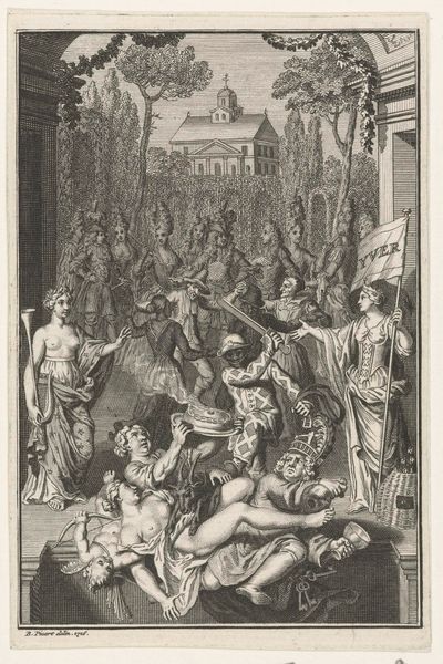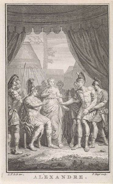 Bernard Picart created this print of Achilles dragging Hector’s body in the late 17th to early 18th century. The scene is depicted with stark lines and a clear composition, drawing our eyes immediately to the foreground, where the lifeless body of Hector lies, contorted unnaturally. Picart masterfully uses the etching technique to create depth and texture. Note how the lines vary in thickness to convey a sense of drama. The contrast is not just aesthetic; it’s a semiotic system. Hector's limp form, the sharp angles of the chariot, and the rigid posture of Achilles all communicate power dynamics. The image isn't merely an illustration of a scene from the Iliad, it's an exploration of the brutal consequences of war and unchecked hubris. The scene challenges conventional heroic narratives, destabilizing any fixed meaning of triumph and glory. The artist invites us to question the values that underpin such violent displays of power.