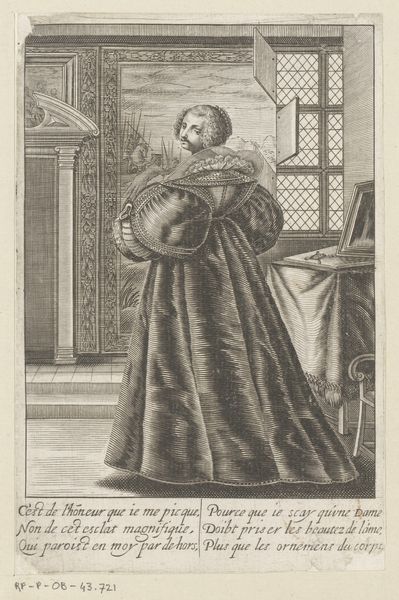 This engraving, made by Gilles Rousselet in France, depicts a young woman representing "Grammar" from a series on liberal arts. The image creates meaning through visual codes and cultural references typical of the 17th century. Grammar, as a foundational skill, is personified by an elegantly dressed woman, suggesting the importance of education within the French elite. The alphabet book she holds symbolizes the beginning of knowledge and literacy, virtues cultivated in the social circles of the time. This artwork reflects the cultural and institutional context of its era, where education was highly valued among the aristocracy. As an art historian, delving into the social history of 17th-century France will offer further insights into the artwork's meaning and significance. Through historical documents, one can appreciate the role of art as a reflection of societal values and institutional structures.