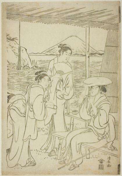 Editor: So this is Katsukawa Shuncho's "Parody of the Seven Sages of the Bamboo Grove," made around 1780 to 1801. It’s a woodblock print, quite delicate and refined. It reminds me of a tranquil scene. What stands out to you in this work? Curator: I'm immediately drawn to the materiality of this piece. As a woodblock print, we have to consider the labor involved, not just of the artist, but the artisans who carved the blocks and made the paper. It prompts us to investigate the complex systems of production and consumption within Edo-period Japan, doesn't it? Editor: That's fascinating! I was mostly thinking about the figures. Curator: And how are they dressed? What kind of fabrics, patterns and dyes do you see, and what can they tell us about class and taste during that period? Were certain designs more labor-intensive and thus more expensive? Furthermore, the concept of “parody” within this piece invites inquiry. What elements are being satirized, and what social commentary is embedded within this representation of women enjoying themselves? Editor: I see…so by understanding the materials and techniques used to create this print, we gain a deeper understanding of its meaning and cultural significance. It's like reading the artwork as a historical document about production as a reflection of consumer values? Curator: Precisely! And remember, the choice of subject matter – women, pleasure, parody – speaks volumes about societal norms and deviations. This challenges the traditional art history narratives that separate "fine art" from the objects of everyday life or “craft.” Editor: That is incredibly helpful! I didn't realize how much information could be gleaned just by examining the materials and the means of its production. I will never see this type of art the same way again. Curator: Exactly. Considering those parameters will hopefully help you analyze any kind of material culture from paintings and architecture to books and instruments.