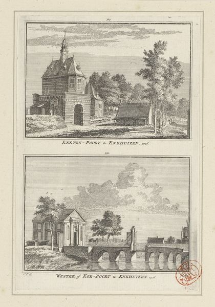 Curator: This print presents two cityscapes of Franeker. Carel Frederik Bendorp, the artist, created "Gezichten op de Oosterpoort en de Westerpoort te Franeker" between 1786 and 1792. These engravings depict the Oosterpoort, or Eastern Gate, and the Westerpoort, Western Gate, of this Dutch city. Editor: I am immediately struck by the contrast between the two views. The Oosterpoort seems more open and pastoral with figures strolling by the water. The Westerpoort, however, appears more enclosed and integrated into the city itself. Both have a peaceful feeling, but it feels more enforced in the bottom depiction. Curator: The scenes certainly evoke distinct atmospheres. The placement of each gate reflects the social and economic life that flowed through them. Consider the Baroque influences in landscape depiction at this time, a sense of harmony and order in the environment became critical. Editor: Yes, it's interesting how Bendorp frames the gates. In the upper image, you see what looks like a more leisurely public space with people near the canals, while the lower cityscape looks like part of someone's back garden! I wonder about who had access to these different parts of the town. Curator: Indeed. The prints offer more than just visual representations; they invite inquiries into Franeker’s social fabric and spatial politics. Bendorp's careful detailing captures elements of commerce and daily life from that era in the Netherlands, each telling their own story. Editor: This piece prompts so many questions about identity and access within urban environments and their legacy even now. It's remarkable how what may seem like just picturesque images opens to critical explorations of historical power dynamics. I see a world behind the details here. Curator: Exactly. These images help connect us to both an awareness of our history as well as an insight into modern day problems. It's fascinating how this single print from the Rijksmuseum offers avenues into Dutch life, the impact of the Baroque style on how the population viewed the landscape and also questions regarding inequalities in our own era. Editor: It reminds us to examine who benefits from constructed and "natural" beauty in our shared world.