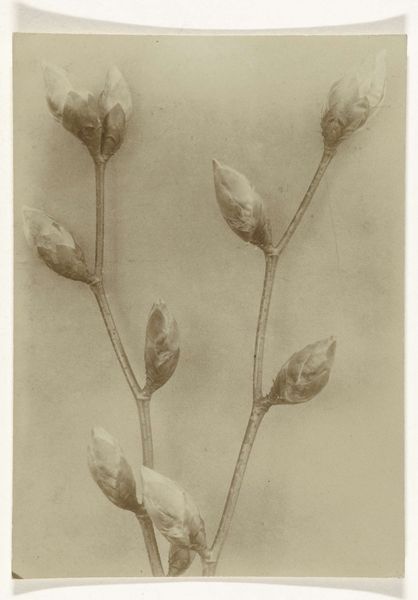 Curator: This is "Tak van een ruwe berk tegen een egale achtergrond," or "Branch of a rough birch against a solid background" by Richard Tepe, dating from approximately 1900 to 1940. It's a photographic print currently held in the Rijksmuseum collection. Editor: It's deceptively simple, isn't it? The starkness of the isolated branch, combined with the monochrome palette, gives it a quiet, almost melancholy feel. Curator: The composition adheres to principles of naturalism, presenting the birch branch with meticulous detail and minimal intervention. Note how the tonal range is delicately modulated. Editor: Indeed, birch trees in folklore often represent renewal and purification. The solitary branch here, though, against the plain background feels almost vulnerable, stripped bare. Curator: The photographic technique itself is part of the artistic statement. Tepe’s choice to isolate the branch against this almost empty background draws attention to its intrinsic form. Notice how the play of light across the leaf surfaces creates depth and texture. Editor: It also makes me think about mortality, the ephemerality of nature. Birch trees, in some traditions, also symbolize protection, though it’s a bit harder to tease that reading out from this particular composition, removed as it is from its natural setting. Curator: Perhaps that ambiguity is intentional. By presenting a single branch, Tepe invites us to focus on the essential qualities of the birch, its structure, texture, and its place within the broader environment without showing said broader environment. It allows the viewer a deeper inspection into form and inherent artistic value. Editor: And the very act of photographing a specific birch, with its specific history—marks of wind and weather on each leaf—also imbues it with a certain significance, drawing the viewer to appreciate the wonder and vulnerability that can come with renewal and change. Curator: It's a compelling piece—precise in its presentation, yet suggestive in its meaning. A testament to Tepe’s keen eye and technical mastery. Editor: A subtle reminder of nature's power and delicacy, caught in a fleeting moment and framed forever.