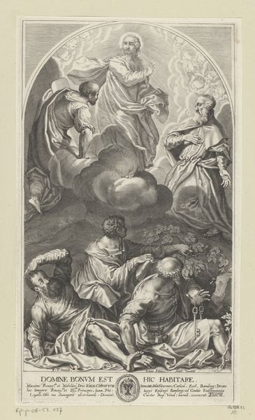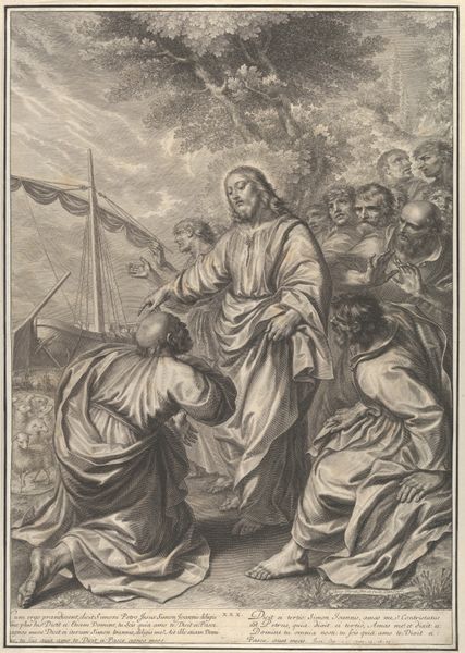 Curator: Lazzaro Baldi's drawing, “Christ heals the sick”, captivates with its narrative drama, skillfully rendered in ink and charcoal. What stands out to you at first glance? Editor: The monochrome palette gives it an almost dreamlike quality. It feels ethereal, almost as though we are witnessing something unfolding outside of reality. The drawing medium also accentuates a sense of fragility and vulnerability within this healing scene. Curator: Indeed, that use of charcoal and ink echoes a common Baroque interest in the interplay of light and shadow to convey profound emotional and spiritual weight. And what's so enduring here is how it visualizes, perhaps quite deliberately, Christ not merely as a healer, but as a conduit for divine grace, literally pouring out into a space teeming with desperation. Editor: Right, and the composition amplifies that effect. Note how Baldi uses diagonals to direct our gaze towards Christ, a brilliant figure surrounded by supplicants and then crowned by angels. All are anchored to the earthly with the suffering in the foreground and aspire towards an unknown promise and cure. Curator: Consider, too, that those angels in the upper register are not merely decorative elements. They are vital visual cues of divine authority. The history of depictions of angels is rooted in this duality, as the image serves as a constant reminder of human capability for good or evil deeds; they're potent reminders of our aspirations. Editor: Fascinating. But in terms of sheer formalism, I find the dynamism achieved with the contrasting tonal values is amazing, especially within such limited hues. There is also a tension that underscores the dichotomy between life and death. It pulls one in closer as a viewing. Curator: The symbols, I think, offer more than just formal devices. Consider the contrast of how that brilliant, white light emphasizes Christ. The very quality of the line in drawing helps create an association between this image and the word. In this drawing, that word becomes action. It becomes real. Editor: Well, no matter how we interpret it, Baldi uses the tools of his art to great and compelling effect. The eye travels across its surface with incredible ease, regardless of our awareness of its history. Curator: And in seeing that impact, we too connect across centuries of those witnessing this divine act.