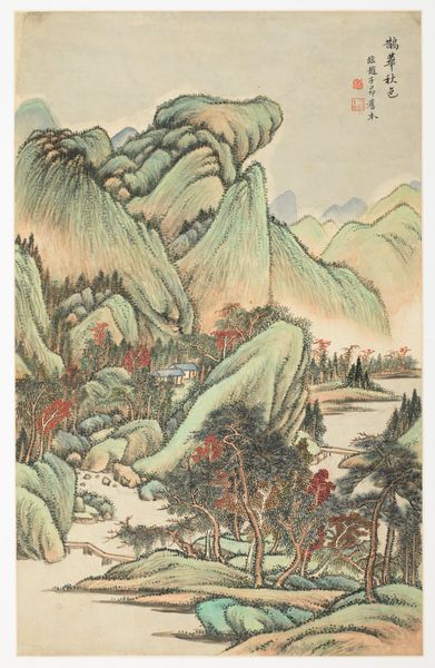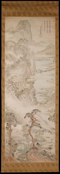 This monumental composition pays tribute to the famous Yuan dynasty scholar-painter Huang Gongwang (1269–1354). It is an attempt to combine two of Huang’s preferred compositional methods in one landscape. One of them is pingyuan, or “level-distance” perspective, defined as looking from a place in the foreground into the far distance across a flat landscape. The other is gaoyuan, or “high-distance,” in which the viewer is placed at the bottom of a grand mountain looking up toward the summit. The painting shows a panoramic level-distance view, allowing the viewer’s eye to be carried back into the depth of the composition through clearly marked stages. A rolling outline closes the high peaks in the background to demonstrate the “high distance.”
