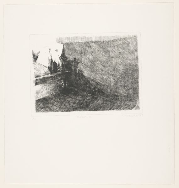 Editor: This print, "Antieke muur te Florence," or "Ancient Wall in Florence" by Nella Pucci, probably made sometime between 1898 and 1935, is an etching that depicts, well, an old wall in Florence. The scene is filled with shadows. What historical context might illuminate our understanding of this print? Curator: It’s crucial to remember that this was a period of intense change and modernization in Italy. The late 19th and early 20th centuries witnessed rapid industrialization alongside a burgeoning sense of national identity, a search for roots. How does Pucci's rendering of this "antique wall" seem to either embrace or resist that modernization? Editor: That's interesting, because I see almost a sense of decay or even defiance in that isolated wall amidst what looks like urban sprawl in the background. A sort of romantic ruin against urban encroachment, maybe? Curator: Precisely. Etchings like these, which found popularity amongst a rising middle class eager to acquire cultural capital, also participated in creating, standardizing and then circulating these images of Italy's cultural heritage. To what extent do you feel Pucci romanticizes this heritage, or critiques the rapid changes Florence was undergoing? Does it feel propagandistic? Editor: I don't see anything necessarily critical here, nor glorifying for that matter. More like it's simply preserving this memory as Italy transitions. Like documentation. I do like how the lines making up the shading really contrast the roofs and trees in the distance. Curator: An astute observation. Perhaps Pucci saw this "ancient wall" as more than just a historical artifact, but as a reminder of the values and traditions that shaped Florentine identity during times of rapid industrial development and urbanization. Editor: That makes me see this print in a new light; it feels almost like a historical preservation effort through art, documenting these locations as Florence evolved. Curator: Yes, that tension between preservation, documentation and romanticisation – or nostalgia – is so typical of this period, and so evident in Pucci’s print. It also highlights the ongoing negotiation between cultural memory and socio-political progress.