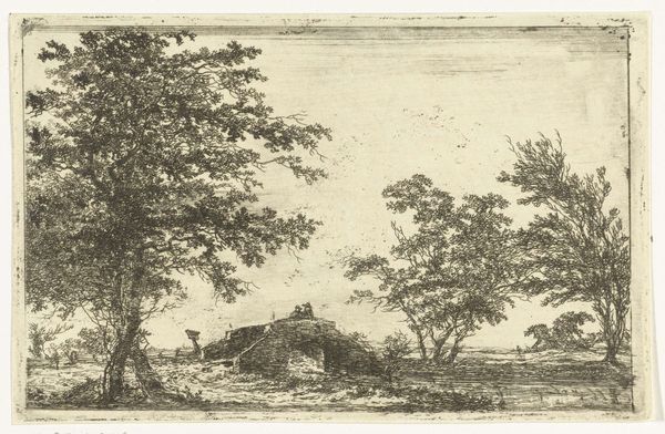 Curator: Looking at Jan van Lokhorst's "Boerderij," a detailed landscape etching from the mid-19th century, what jumps out at you? Editor: Immediately, it feels like peering into someone’s memory, or a dreamscape faintly recalled. It's monochromatic, like a faded photograph, evoking a sort of quiet melancholy. Curator: That's interesting. The texture is remarkable given its medium. Van Lokhorst uses a combination of etching and ink to render this rural scene, focusing on the detailed textures of the thatched roof and weathered wooden structures. His representation resonates with the social realities of 19th-century rural life, highlighting a romanticized vision of peasantry. Editor: Yes, you can almost smell the damp earth and hear the rustling of leaves. It's idyllic in its simplicity but the dilapidated state of the house is striking, as if to convey something about resilience amid hard times. It's more than a pretty picture, you know? Curator: Absolutely. By situating this artwork in its historical and cultural setting, we see beyond pastoral beauty. Van Lokhorst perhaps uses this setting to talk about land ownership, or rather the lack thereof, within agricultural communities, echoing larger debates about social class and inequality. Editor: I hadn't thought of that directly, but that reading lends a real gravity to what at first seems like just another landscape piece. The placement of the tiny figures is thoughtful, really makes you ponder on humanity's place within the natural world. It is as though they have merged into one. Curator: These depictions tie into the romantic idealization of rural folk. But at the same time, they raise issues concerning labor exploitation and marginalization, thus bridging themes within realism and landscape painting. It prompts us to critically examine social representations, offering dialogue concerning both progress and oppression. Editor: Thinking of it like that, this piece holds a certain tension—a dance between romanticism and realism, a reflection on life's beautiful hardship. A bit like looking at the past and suddenly seeing the future hidden in the background. Curator: Indeed. Van Lokhorst gives us more than a landscape; he gives us an insight into the dialogues and social commentary prevalent in art. It calls on critical engagements with histories as we analyze present landscapes. Editor: So simple, and yet it leaves me feeling richer, somehow. It really makes one stop and feel thankful to be a part of the conversation.