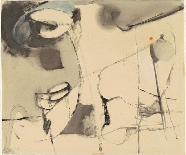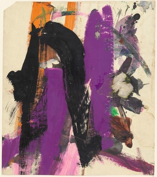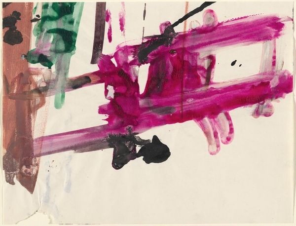 This untitled painting was made by Franz Kline, with paint on paper. The bold strokes and raw energy, it's like watching Kline work through his ideas right in front of you. There’s something so direct about the way Kline attacks the surface. The black marks aren't precious; they're laid down with a kind of urgency. But then you notice the colors underneath, the purples, the greens, even a little yellow peeking through. It's not just about the black and white drama, it’s like the underpainting is a ghost of previous ideas, haunting the finished piece. Look at the upper left area, where the colors mix, where the brushstrokes are really visible. It's a reminder that painting is a process, and that even in the most decisive-looking works, there's a history of searching and finding. It makes me think of Cy Twombly, with that same sense of gesture and openness. Ultimately, this piece is about the joy of the process, and the beauty of imperfection.