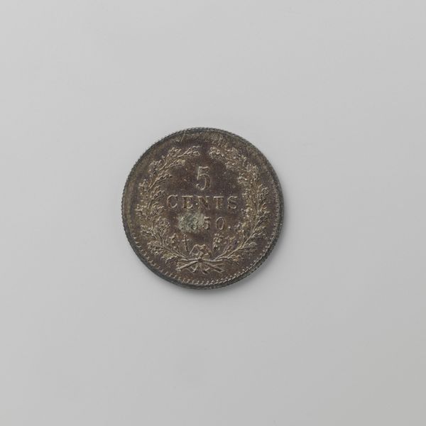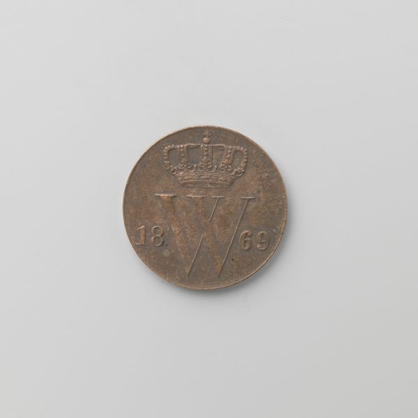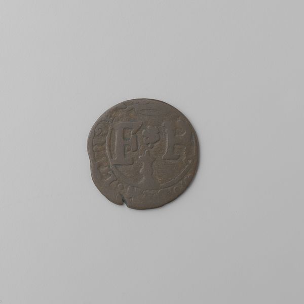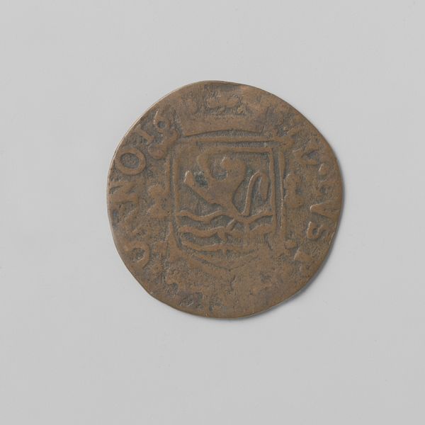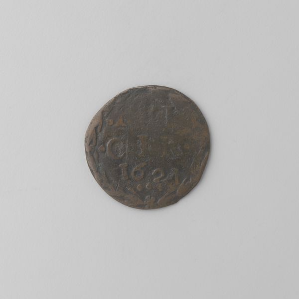 Curator: A modest object, but rich with history. We're looking at an Overijsselse duit, a small coin minted in 1628. The material is metal, with an engraving creating its intricate design. Editor: It feels like something unearthed from a forgotten time. I notice the circular shape and the detailed inscription—there is almost an archaic aesthetic. Is there a way of knowing the function and distribution context? Curator: Absolutely. These "duiten," as they were called, were low-value copper coins, integral to daily transactions in the province of Overijssel during the Dutch Golden Age. They were instruments of economic activity. Editor: So the material simplicity served a clear purpose. Looking closely at the inscription, one can observe botanical forms intermingling with the textual arrangement. What could be the correlation? Curator: A good point. The Baroque era was characterized by elaborate ornamentation, visible here not just in lettering, but the floral design surrounding the text as well. I would suggest there is visual rhetoric, one designed to elevate an otherwise rather utilitarian object. Editor: Yes, that artistic flourish definitely adds layers to what might otherwise seem mundane. Do the marks or wear patterns tell a story, or add a sense of provenance that reveals other possible meanings for interpreting its status within Overijssel society? Curator: They do, don't they? Those nicks and scratches are, if we choose, entry points into the lived experience. Its worn state hints at its constant circulation in the bustling markets and lively port cities. This coin likely passed through countless hands. Editor: Imagining its trajectory through history does indeed alter how one interprets it. Perhaps its meaning surpasses monetary worth, and it served a function beyond its prescribed purpose within that economic system. Curator: Perhaps so. It serves to show us that sometimes, it's in these minor objects that major narratives can unfold, bridging material and historical investigation. Editor: An appropriate reflection, as such artifacts invite both a nuanced aesthetic contemplation and contextual understandings.