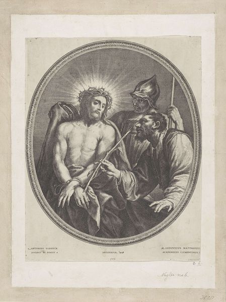 This print by Charles van Boeckel presents Christ crowned with thorns, a stark symbol of suffering and mockery. This image is a powerful emblem, deeply rooted in the collective memory of the Passion of Christ. The crown of thorns is a twisted parody of royal power. We can trace the motif of the crown throughout history, from laurel wreaths symbolizing triumph to royal crowns representing earthly authority. Here, the thorns invert this symbolism, transforming it into an emblem of humiliation and pain. This motif resonates across cultures, echoing in images of martyrdom and sacrifice where suffering is linked to spiritual transcendence. The image evokes a visceral emotional response. The sharp thorns, the blood, and Christ's resigned expression all combine to create a powerful representation of human suffering. The non-linear progression of this symbol is clear: from ancient rituals of honor to scenes of agony, the crown remains a potent emblem, its meaning reshaped and reinterpreted across time.