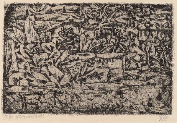 Editor: We’re looking at Glen Alps’ "Space Tensions" from 1956, a print from the museum’s collection. There are so many lines crisscrossing each other, it’s chaotic, almost stressful to look at. What do you make of this density? Curator: I see it as a reflection of its time. The mid-20th century was a period of enormous social and political upheaval. Abstract Expressionism, as seen here, became a powerful visual language to express anxieties about the human condition. Alps' layered lines can be interpreted as representing the complexity and instability of the postwar world. How does the title “Space Tensions” strike you in this context? Editor: Well, I immediately think about the Cold War tensions and the threat of nuclear war that hung over everything. I guess I see that fear of the unknown represented in those harsh, clashing shapes. But doesn't all Abstract Expressionism have some sense of postwar dread to it? Curator: It's a prevalent reading, yes. The "tensions" in the title, however, can also be viewed in relation to artistic conventions. Abstract Expressionism sought to break free from established aesthetic norms. So, perhaps, Alps is also dealing with his personal artistic struggles, wrestling with how to create something meaningful in a world undergoing rapid change, or even to represent something on the flat picture plane. Notice the lack of a focal point. Do you think that lack is purposeful? Editor: I see what you mean. I didn't think about that aspect. It’s like there is no anchor, which feeds that feeling of uneasiness. I always thought Abstract Expressionism was about personal expression, so I am intrigued to hear that you consider the context of socio-political issues and institutional power as relevant and intertwined with the art. Curator: It's about both. The personal and the political are not mutually exclusive, especially in art that aims to capture the zeitgeist. We often underestimate the extent to which artistic freedom is contingent on patronage systems, government policies, and museum collecting habits. This work would not exist without the confluence of these elements. Editor: I'll never look at Abstract Expressionism the same way again. It's amazing how much context changes my perspective. Curator: Exactly. Understanding that interplay between artist, artwork, and the world it inhabits is key to appreciating art's profound impact.