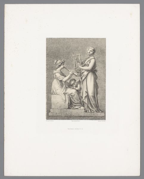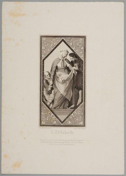 Curator: It's a somber composition, isn't it? The stark contrast between light and shadow seems to suggest a protective, but also burdened, atmosphere. Editor: This is "Angelus Custos" by Xaver Steifensand. Considering Steifensand's life, born in 1809, this piece resonates with the 19th-century anxieties about childhood innocence and vulnerability amid rapid social changes. Curator: Indeed. The angel's guardianship isn't merely spiritual; it speaks to the very real precarity faced by children in that era, especially within unequal socioeconomic structures. Is the child meant to represent any particular social class? Editor: Possibly, or perhaps the child is a universal symbol of innocence needing protection. The angel's gesture and the cross on their chest suggest faith as the primary shield. Note how the angel is composed within a descending diagonal line. Curator: The angel is posed to lead the child away from some kind of path, and the child is seemingly oblivious to the dangers. Are we meant to believe the angel is intervening with destiny? Editor: The symbolism is strong, but it also directs our gaze along those diagonal lines, from the angel’s wing down to the child’s outstretched hand. Curator: Ultimately, it’s a poignant reminder of our shared responsibility to safeguard the well-being of future generations. Editor: A beautifully balanced, yet fraught image.