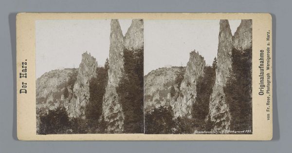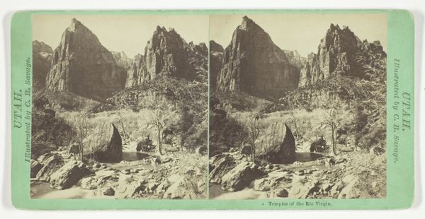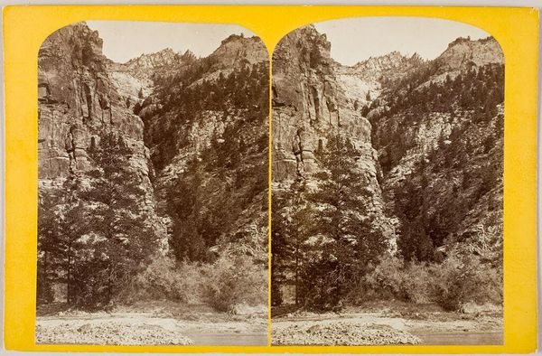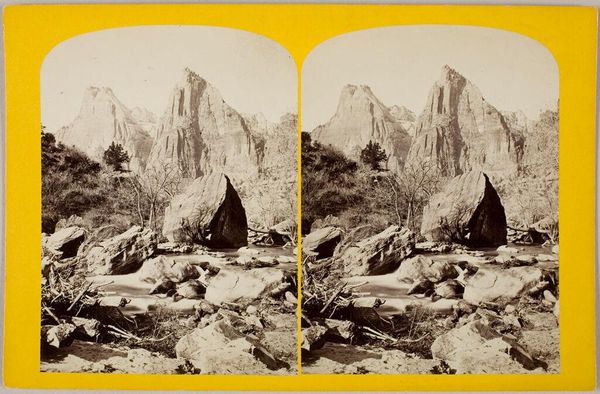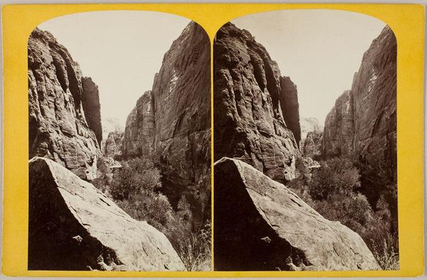 Curator: This is a stereograph titled "Rocks" by John K. Hillers. Stereographs like this one offered 19th-century viewers a sense of immersive experience. Editor: It feels monumental, yet small. The way the rocks tower—it suggests resilience, a defiance against time and weathering. Curator: Absolutely, and the very act of photographing the landscape, particularly by someone associated with westward expansion, invites a dialogue about power, representation, and the romanticization of the frontier. Editor: The rock, as a symbol, has always represented strength and endurance, but here I wonder if it’s also about the weight of history, both geological and human. Curator: I think you're right. Considering Hiller's positionality, there's a tension between preservation and exploitation inherent in this seemingly straightforward depiction. Editor: Exactly. So, this photograph offers a complex meditation on permanence and change. Curator: Indeed, it prompts us to think about the enduring impact of landscape on identity and history.