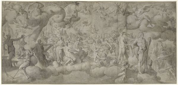 Editor: This is "Christus laat de kinderen tot hem komen," made around 1510, currently at the Rijksmuseum. It's an ink, watercolor, and wash drawing on toned paper. There's something really gentle in the figures, despite the chaotic composition and the imposing classical ruins. What do you see in this piece, especially considering its historical context? Curator: This work, even in its seeming simplicity, opens a space for intersectional dialogue. Considering its origins in the Early Renaissance, let's think about the power dynamics at play. We see Christ, a central figure, surrounded by children – often a marginalized group. What does it mean to portray them as worthy of his attention, within a patriarchal society? Editor: That's a fascinating point. It challenges the conventional hierarchy, almost subversively. The setting—a mix of ruins and nature—how does that play into it? Curator: Exactly! The crumbling architecture symbolizes the fading old order, making way for a new, perhaps more inclusive, spiritual era. It also asks us to think about what narratives have historically been privileged over others and whose stories we're *not* seeing in similar works of this era. What voices are absent and whose power is elevated by the narrative of this painting? Editor: So, it’s not just a sweet scene, but also a statement about social transformation. It makes you wonder about the artist's intentions regarding social reform. Curator: Precisely. It's a reminder that even ostensibly religious scenes can reflect—and even subtly critique—the sociopolitical realities of their time. Considering questions about power, privilege, and whose stories are being told. It invites us to actively engage with the artwork and see it as an invitation for social dialogue. Editor: That really gives me a new way to look at Renaissance art. Thanks, I'll keep those ideas about context and social narrative in mind!