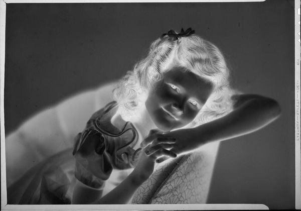 Editor: This arresting photograph, "Untitled (Eugenie Stoll)" by C. Bennette Moore, presents a child in stark monochrome. Its dreamlike quality intrigues me. How do you interpret this work? Curator: The reversal of light and shadow evokes a powerful sense of memory, almost as if we are peering into a half-forgotten dream. Note how the subject's gaze holds a certain luminosity. Do you think that gives her a timeless quality, divorced from any specific era? Editor: It does. It almost feels like we're seeing an angel or a ghost. Curator: Yes, it transcends a simple portrait. The photographic negative itself functions as a symbol - an inversion. Moore is not only capturing an image, but perhaps also exploring the hidden or unseen aspects of childhood itself. It’s a powerful meditation. Editor: I never thought of it that way; I was focused on the visual effect. Curator: These images remind us of the power of the photographic medium to unlock deeper psychological or cultural truths through symbolism.