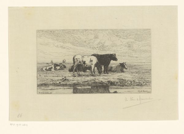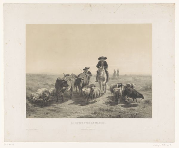 Curator: So, here we have a photograph titled "Fotoreproductie van een schilderij van Rosa Bonheur van een herderin met schapen," which translates to "Photographic reproduction of a painting by Rosa Bonheur of a shepherdess with sheep." It's dated around 1890-1910. Editor: It's beautifully serene. All soft edges and gentle light, the kind that makes you want to sink into it and never leave. Almost like a faded memory. Curator: Yes, there's a romantic quality to the print and certainly an echo of the original painting, which itself leans into realism, yet through the lens of a burgeoning romantic sentiment towards nature and pastoral life. The material itself is interesting too, printed on a toned paper which mutes the color palette. It’s all about the subtle gradations. This was probably commercially produced. Editor: Commercially produced! It still retains a sense of intimacy. The lone shepherdess watching over her flock, so isolated yet connected. It’s hard to believe it might be some kind of product intended for wider consumption. Is she real or performing? It feels deeply symbolic somehow. Curator: Exactly, we see the industrial era reaching into art. Reproductions like this made art more accessible, shifting both consumption and value. Consider the labor involved in creating the original artwork, versus the labour to reproduce it. The difference in skill and in pay is striking. Also what this mass consumption of 'art' may have done to peoples idea of value. What do you really connect with, the art, or its idea? Editor: It speaks volumes about the longing for simplicity, the desire to escape the grime of industrialization by owning a cheap pastoral print, to romanticise manual labour! Isn’t there a fascinating tension at play? Curator: Precisely! The tension between the idyllic subject matter and the mechanics of its dissemination highlights how deeply interwoven these perceived opposites really are. We must be aware when consuming art or photographic "art" of its place and creation! Editor: What a thought! Suddenly that gentle light has a slightly harder edge. And so a bucolic fantasy becomes a commodity to be considered within the history of late capitalism... That does sober things up a little!