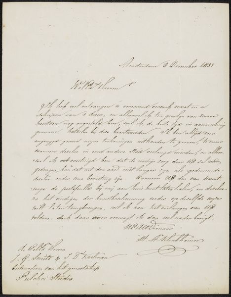 Curator: This is “Brief aan Frans Buffa en Zonen,” which translates to “Letter to Frans Buffa and Sons," penned possibly in 1877 by Richard Unger. The artwork is crafted using pen and ink on paper. It's a rather intriguing example of personal correspondence elevated to the realm of art. Editor: My first impression? Mystery! It’s like stumbling upon a coded message. The handwriting feels almost like a delicate web spun across the page. I am immediately curious about its contents. Curator: Indeed. These kinds of letters offer invaluable glimpses into the artistic networks and daily lives of artists during this period. Letters were a primary method to document exchanges between colleagues. They give unique context to a given subject's art. Editor: It makes me wonder, what profound secrets, creative musings, or mundane details are locked within those elegant swirls of ink? Did Unger and Buffa ever imagine one of their private correspondences being closely analyzed for artistic value? Curator: Unger appears to discuss financial matters within a network of colleagues—requesting payment to Müller from professor Unger. As we contextualize it today, the letter gains new layers. It sheds light on how these relationships shaped not just artistic creation but also economic survival for these artists. Editor: And to think that each stroke was made with deliberate, thoughtful gestures. Each blot of ink on paper can offer subtle nuances of personality and the human touch absent from digital interactions today. Imagine the care in sealing the letter, knowing it held a part of oneself. Curator: Absolutely, which makes the presentation quite remarkable when contrasted with mass media’s overwhelming output in modern society. One single page of a letter can illuminate a forgotten world through a tangible and fragile source. Editor: So true! It’s as if we're reaching through time to connect with these people and peek inside their thoughts. It’s more than just an artwork; it's an intimate, whispered conversation. Curator: Well put! Looking at Unger’s work again reminds us of the simple means from which complex art ecosystems thrive. It is a window through art historical study that reveals so much more than any one artwork. Editor: Yeah, after our little exploration, I realize that "Brief aan Frans Buffa en Zonen" isn’t just an old letter—it's a captivating snapshot of a very personal, yet professional interaction that allows the public to share insight.