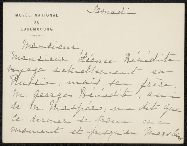 This is a letter, 'Brief aan Philip Zilcken', by Léonce Bénédite. It's an artwork because the gestures of its marks are more than just language, they're alive, like a drawing. The ink is thick, pooling in places like dark water. See how the words lean and dance, some almost falling off the page? The letters bump into each other, a bit awkward, but intimate, like a crowded party. It reminds me of Cy Twombly's scrawls, but with more intention to be read, more effort to communicate. Look at the 'J' in 'Je serai', it's like a little flag waving, announcing the start of a thought. The whole letter is a performance, a delicate balance between control and letting go. Like a dance between friends. It shows how we can find expression and connection through the simplest of means.