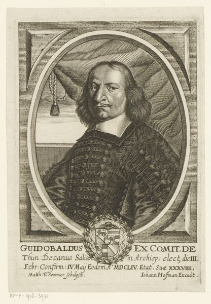 Curator: Look at this intriguing engraving, currently held at the Rijksmuseum. It's entitled "Portret van Luigi de Guzman", dating sometime between 1660 and 1704. Editor: It immediately evokes a sense of austere formality. The fine lines create almost a tapestry-like texture, particularly within the oval frame and drapery, but his gaze is rather direct. Curator: Considering its historical context, portrait engravings like this served an important function. They disseminated images of powerful figures, reinforcing their status and influence throughout society. Guzman's position is also inscribed on the plate beneath the portrait. Editor: Right, the inscription. It speaks volumes! From what I gather, Guzmán was clearly someone of immense importance: "Captain General of the State of Milan," for starters. And I see his armor with its odd key insignia—symbols within symbols. Keys traditionally symbolize access, knowledge, and even authority. Was this an established symbol within his family? Curator: The key motif, especially during this period, can certainly allude to control and governance. Milan's fraught status within the Spanish empire and European politics more broadly cannot be overstated: Spanish governance extracted enormous amounts of wealth from the Italian region even as their neglect and misrule were locally resented. To whom, then, was Guzman offering entry? Editor: Fascinating. The column, half-hidden behind the drapery, suggests a stability, perhaps meant to enforce this same control and dominance you just brought up. It lends a certain weight, a feeling of enduring power. I think he's inviting us to see this legacy. Curator: The artist Cesare Fiori designed the print, and Durello engraved it, so a combined project of legitimization by two artists towards Milan and its representation within broader Spain. By controlling visual access and dissemination, who and what did they aim to represent? Editor: Seeing how this portrait operated within its specific historical context allows one to perceive how such displays could be used to establish social hierarchy through very deliberate manipulation of imagery and symbols. Thank you. Curator: Absolutely; seeing this period through the lens of visual imagery provides valuable insight into 17th century politics and power structures. It provokes critical inquiry!
