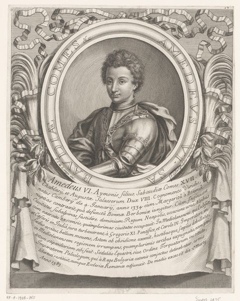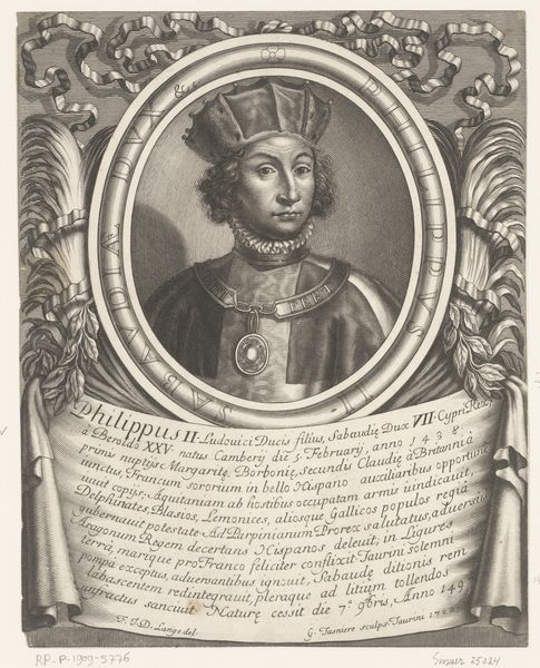 Georges Tasnière made this print of Filibert II sometime around the turn of the 18th century. It gives us an insight into the social function of portraiture at the time. Prints like these were less about the individual likeness, and more about conveying status, power, and dynastic lineage. Look at the symbols: the crown, the ermine robe, the elaborate frame. These are visual codes that communicate Filibert's noble rank. The Latin inscription below adds another layer, listing his titles and achievements, situating him within a historical narrative of power. Tasnière was working in a period when printmaking was becoming increasingly important for disseminating images and information. Portraits like this circulated among a specific elite audience, reinforcing social hierarchies. As historians, we need to consider the context in which this print was made and consumed, looking at sources like letters, inventories, and other visual materials to understand its role in the cultural landscape of the time.