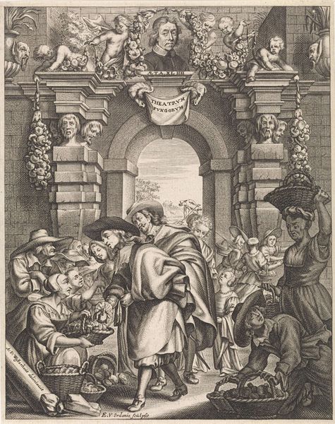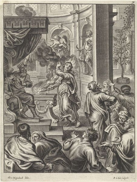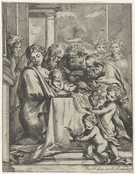 Curator: This print, dating from 1583, presents "The Holy Family with Saint Anne and John the Baptist." It’s an engraving by Pieter Perret, who worked primarily in Rome and Spain. Editor: It's immediately striking – that almost tangible sense of tenderness and intimacy. Even through the fine lines of the engraving, you feel the connection between the figures. Curator: Absolutely. Perret was operating in a nexus of artistic exchange. Consider how this image likely circulated: prints such as this democratized art, disseminating religious iconography to a broader audience than could afford paintings. Editor: And the arrangement! The central image of Mary holding Jesus mirrors countless depictions, but here, including Anne and John shifts the focus slightly. There's an emphasis on lineage, on prophecy. John’s presence subtly foreshadows the future, casting a faint shadow. Curator: It's fascinating how these visual cues operated within the social fabric. Images were never neutral. They could be used to consolidate religious authority, or to encourage personal devotion. Look how meticulously Perret renders the architectural details, hinting at the importance of location in shaping beliefs and behaviors. Editor: That draped fabric and architectural background serve a specific purpose. The drape has an inviting affect. Also the column on the side of the print adds to the holy presence portrayed through the image. You also have to consider the symbol of motherhood. Curator: Indeed. These prints acted as vehicles for the widespread transmission of religious values within the public domain, effectively embedding those ideals into daily life. The Roman context and its history add a unique flavor. Editor: Looking closely, that infant John gazes so intently at Jesus. It underscores the deep bond between them. There's a sense of shared destiny already unfolding, wouldn’t you say? I keep circling back to those children. Curator: I concur. The very act of creating and distributing these engravings was imbued with socio-political power, playing a pivotal role in shaping people's beliefs and social mores of the era. Editor: Reflecting on this image, it reveals how symbols evolve, how personal narratives are woven into larger religious tapestries. I notice there is the lamp on the ground which may have a meaning with the figures presented in the art. Curator: It's truly a testament to how artists utilized their craft to engage with, and indeed influence, their contemporary world. By observing a picture, like this one, there may be symbols behind certain presentations.