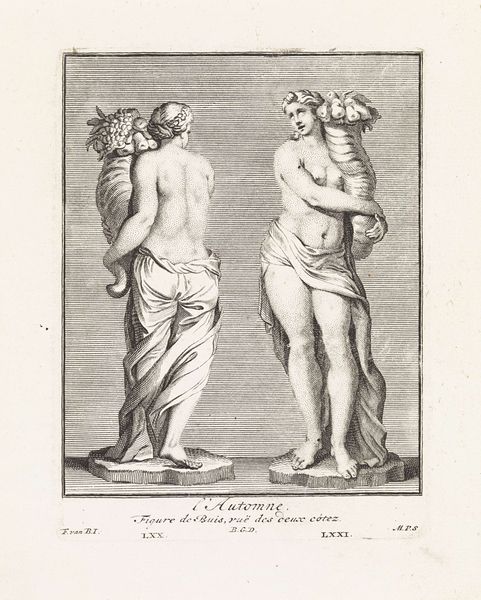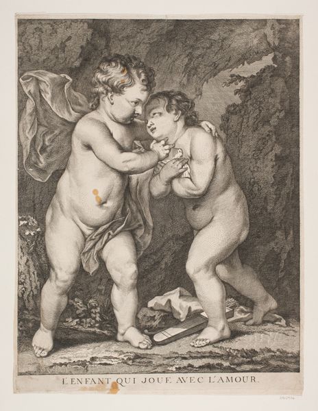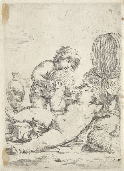 Luca Ciamberlano made this engraving of two boys, one holding grapes, around the 17th century. Engraving is a printmaking process that involves cutting lines into a metal plate, filling them with ink, and then pressing the plate onto paper. The quality of the line is what gives this image its character. You can really see the artist's hand through the marks, giving the figures volume, texture, and a sense of depth. The process is laborious, demanding both precision and physical strength. The engraver must have a deep understanding of how the tool interacts with the metal. The cultural significance of prints lies in their reproducibility. They democratize images, allowing for wider circulation, and enabling people who might not be able to afford an original painting to own a work of art. By focusing on the materials and making processes, we can see how this print reflects both the skill of the artist and the broader social context of its creation. It’s an example of how close attention to the means of production can open up our understanding and appreciation of art.