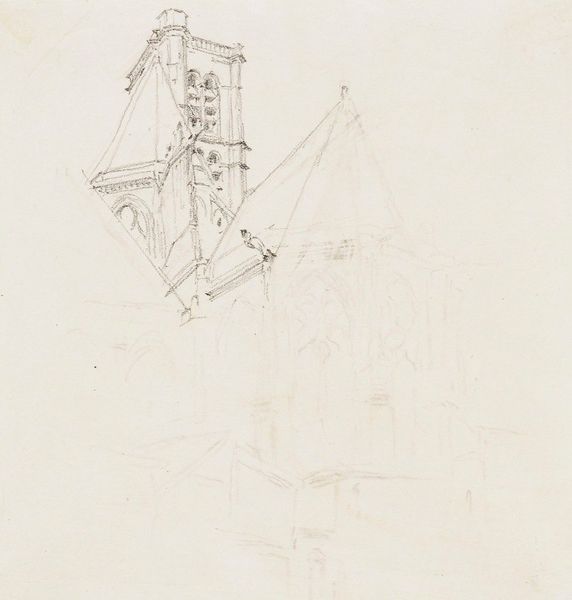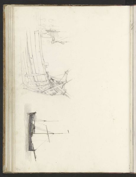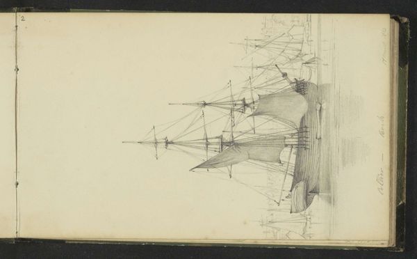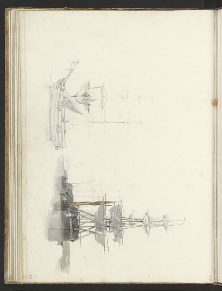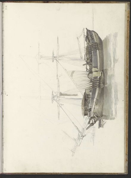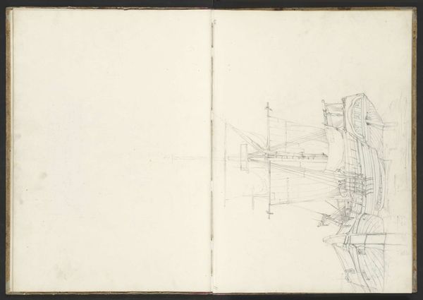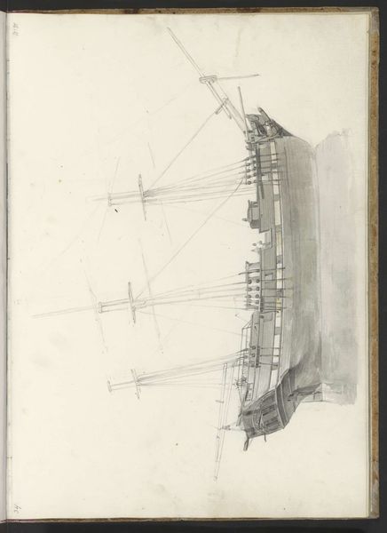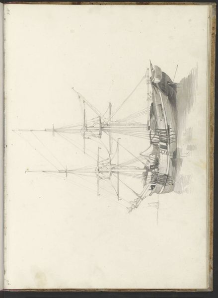 Editor: Here we have "Zeilschip," a drawing of a sailing ship by Johannes Christiaan Schotel, dating sometime between 1797 and 1838. It's graphite on paper, and there's something very sparse about the image. The ship itself is quite detailed, but it’s just a fragment, almost ghostly against all that white space. What do you see when you look at it? Curator: Well, I'm immediately drawn to the labor involved. Think of the timber that was felled, shaped, and transported, and the skill needed to construct such a vessel. Even in this preparatory sketch, Schotel reveals the materiality of maritime commerce. Editor: A preparatory sketch? Is this a study for a larger piece then? Curator: Possibly. Look at the line work—economic, yet descriptive. He's not just depicting a ship, but capturing the physical reality of shipbuilding. Consider, too, the social context: Holland was a major maritime power. These ships weren’t just pretty pictures; they were crucial to trade, colonization, and military strength. Editor: So, it’s not just the artistic process, but also the historical process that makes it significant? Curator: Precisely! And don’t forget the paper itself. Where did that come from? The linen rags, the labor of pulping and pressing. Everything in this image speaks to a chain of production. We should think about who profited from both the construction and the depiction of this ship, and what that tells us about power dynamics at the time. Editor: I hadn’t considered that the paper had its own story to tell! This definitely sheds a new light on the drawing beyond just the representation of the ship. Curator: Exactly, by looking at the materiality, the drawing starts telling richer and unexpected stories.