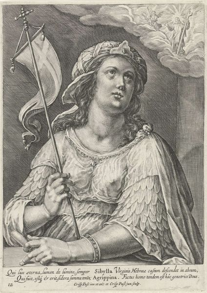 Curator: This is François Verdier's rendering of Saint Anatolia, currently residing in the Harvard Art Museums. I'm immediately struck by the composition. It has a luminous, almost ethereal quality, don’t you think? Editor: Curator: Absolutely. Verdier's masterful use of light and shadow lends itself to that effect. The lines, the materiality, they guide your eye to the focal point: Saint Anatolia and the sword. What do you think she's looking at? Editor: Maybe a vision. Or perhaps she's calling upon a higher power. I like how her stance suggests a delicate balance between vulnerability and strength. Curator: Her narrative, as the one who heals, really resonates with the drawing's composition and Verdier's delicate strokes. The city on the water in the background only enhances the drama. Editor: Indeed. I walk away feeling I've witnessed a moment of profound personal revelation, subtly rendered. Curator: Precisely, and that's the enduring power of Verdier’s Saint Anatolia.