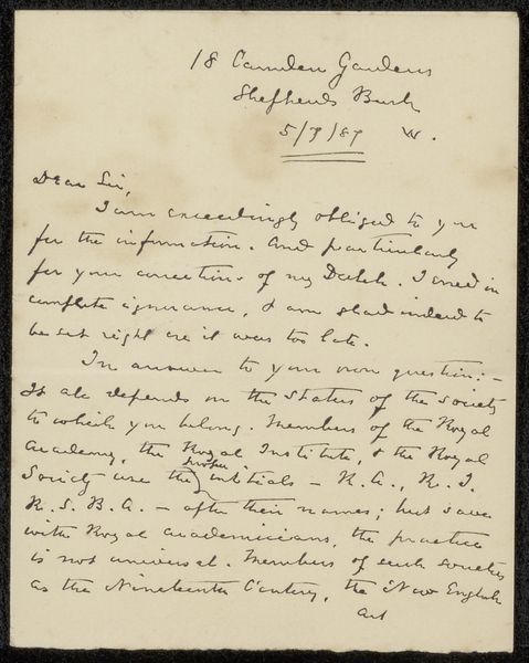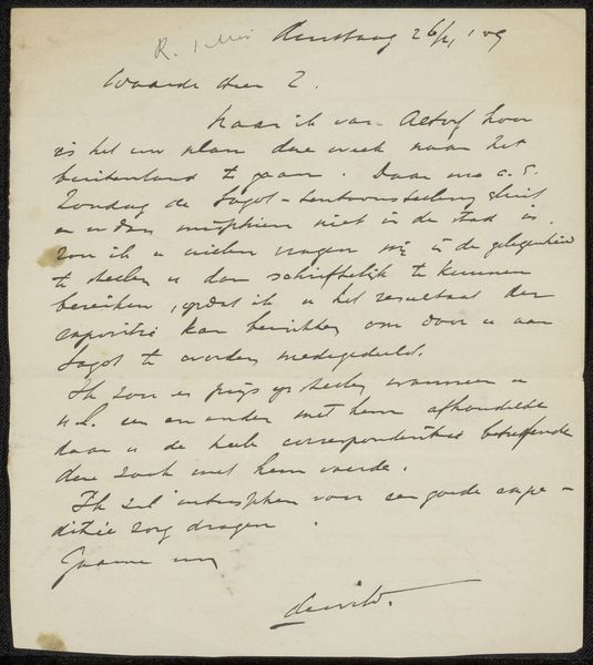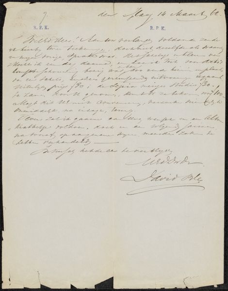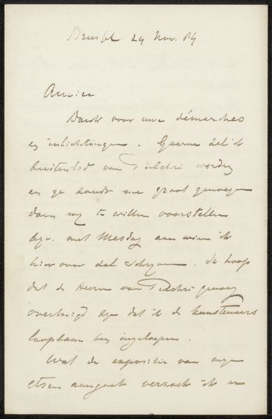 Curator: Take a moment to regard "Brief aan Philip Zilcken," a letter dating from around 1887-1888, crafted by William Ernest Henley. This piece resides here at the Rijksmuseum, rendered in pen and ink on paper. What catches your eye immediately? Editor: Well, formally, the density of the script creates an intriguing visual texture. The weight and flow of the ink articulate the space, forming almost abstract shapes even before deciphering the actual content of the letter. The color contrast isn’t something remarkable as it is just the shade of the ink and paper. Curator: Yes, the medium is key. Pen and ink—readily available, economical. What does this imply about Henley's process, his intended audience? Was this a draft, a working document, or something more considered, destined perhaps for wider circulation within specific circles? Editor: The handwriting suggests a certain informality, a directness. This could reflect the relationship between Henley and Zilcken, revealing something about the social dynamics between them as members of the 19th century cultural scene. But does the informality impact on the effectiveness of the message's composition, like when you read it? Does it prevent legibility? Curator: That's precisely what interests me! What was the nature of Henley and Zilcken’s professional relationship, their shared social and intellectual contexts? Understanding these production factors helps decode the letter’s significance beyond its literal meaning. The references to Mancini and Van Wisselingh invite further questions. Editor: I find it beautiful how the very imperfections of handwriting—the variations in pressure, the occasional splatters—infuse the letter with humanity. And let's observe how Henley balances the textual blocks. Can we analyze these through the lens of formalism to derive deeper meaning? Curator: Of course! Considering the social and artistic networks, Henley's letter isn't merely a personal missive but rather a crucial element of artistic exchange, providing vital clues for understanding his broader literary contributions and their making process. Editor: Indeed. By looking closer at Henley’s "Brief aan Philip Zilcken", it’s an aesthetic encapsulation of thought and human connection in time, expressed visually and historically. It prompts me to rethink about its place within the artistic movements during that era.
